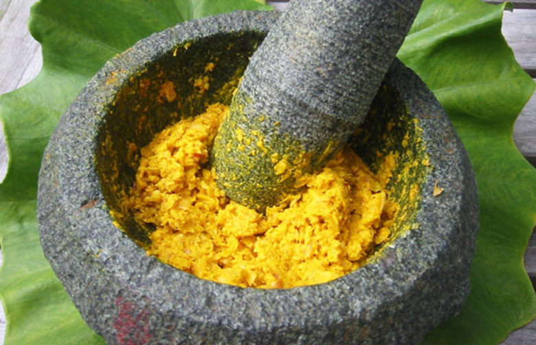 Bạn gọt sạch vỏ nghệ tươi, giã nhuyễn rồi vắt để lấy nước cốt