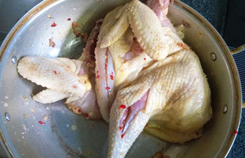 Đầu tiên, bạn dùng muối hạt trắng chà xát lên bề mặt con gà để khử sạch mùi tanh, rửa gà lại nhiều lần với nước.