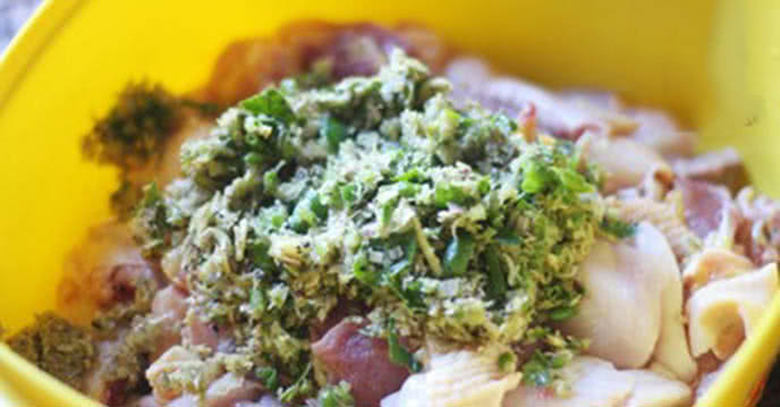 Tiếp theo, bạn cho hỗn hợp gia vị vừa giã nhuyễn vào ướp đều với thịt gà đã chặt miếng. Để thịt ít nhất 1 tiếng để gia vị được thấm đều.