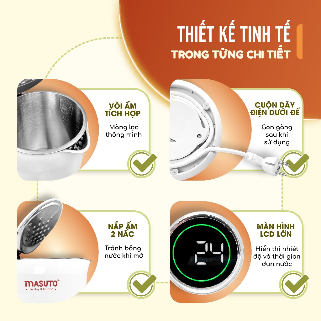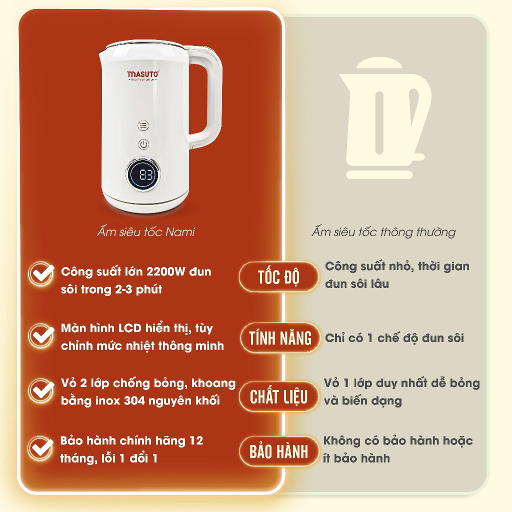 Ấm siêu tốc Masuto MSNami - Bắt nhịp cuộc sống: Trong cuộc sống hiện đại hối hả và phát triển nhanh chóng, bạn sẽ nói lời từ biệt với sự chờ đợi nhàm chán bưởi ấm có công suất siêu lớn lên đến 2200W, có thể đun sôi 1.7L nước trong 3 phút. 3 chức năng: đun sôi riêng, giữ ấm riêng, và đun sôi kết hợp giữ ấm, đáp ứng cuộc sống hằng ngày cho gia đình bạn. Hơn thế nữa, ấm có màu trắng sứ sang trọng cho mọi gian bếp, bắp nhịp với cuộc sống hiện đại.