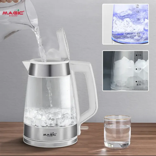 Thân ấm được làm bằng thủy tinh cao cấp, lớp ngoài cách nhiệt hạn chế bỏng khi vô tình chạm vào, không gây mùi và không gỉ sét. Thiết kế này còn giúp giữ nhiệt lâu hơn, nước không nguội quá nhanh sau khi đun sôi.
