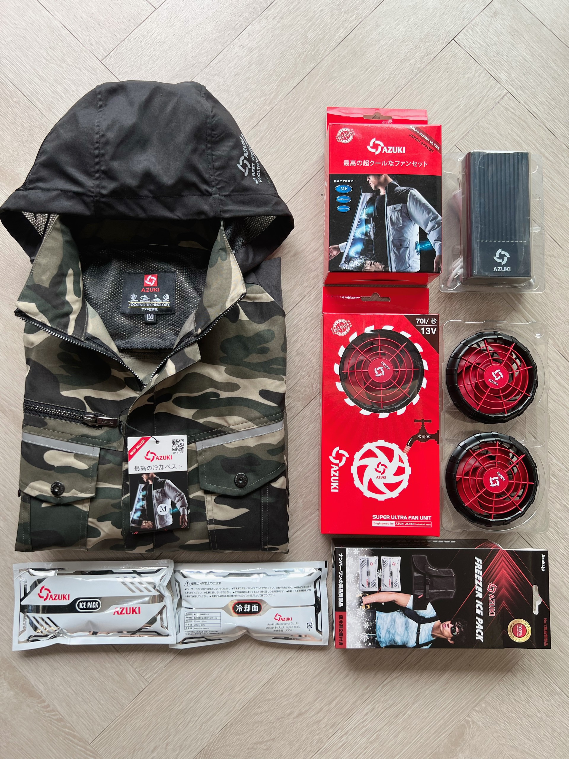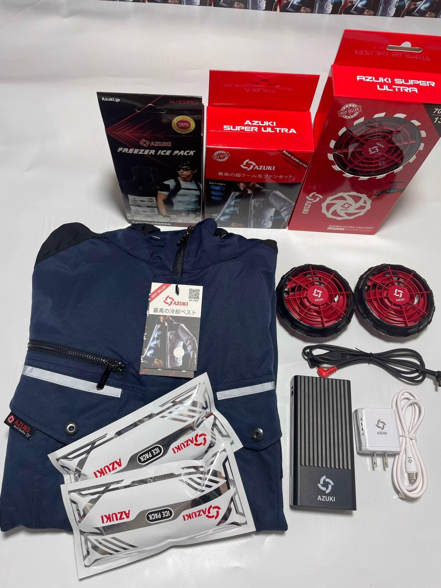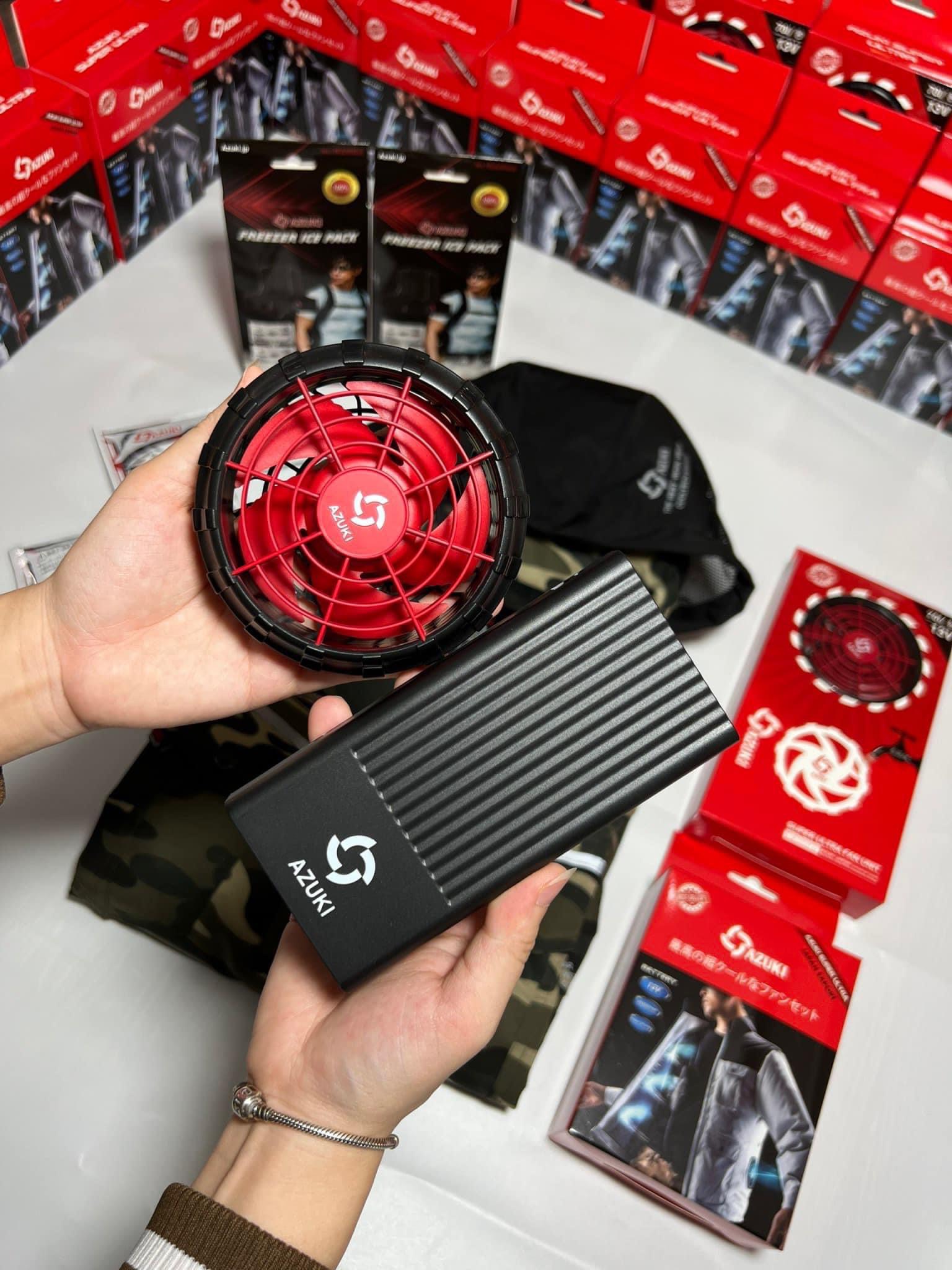 Bộ Phụ Kiện của AZUKI bao gồm: 1 áo chuyên dụng + 1 pin Azuki Ultra 26000mah + 2 quạt + 1 dây nối + 1 sạc