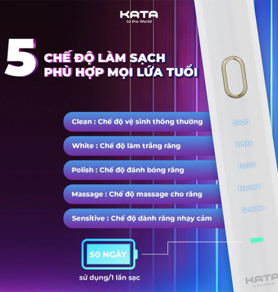 Bàn chải đánh răng điện KATA WT001 là thiết bị chăm sóc răng miệng thông minh, ứng dụng công nghệ rung siêu âm giúp làm sạch mảng bám hiệu quả hơn gấp nhiều lần so với bàn chải truyền thống. Với thiết kế hiện đại, tính năng đa dạng và độ an toàn cao, KATA WT001 đang là lựa chọn hàng đầu cho người dùng hiện đại quan tâm đến sức khỏe răng miệng.![]()