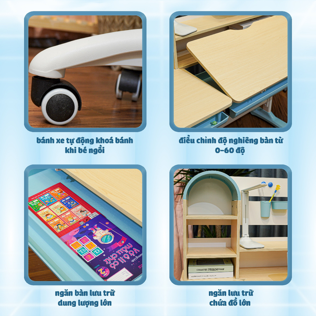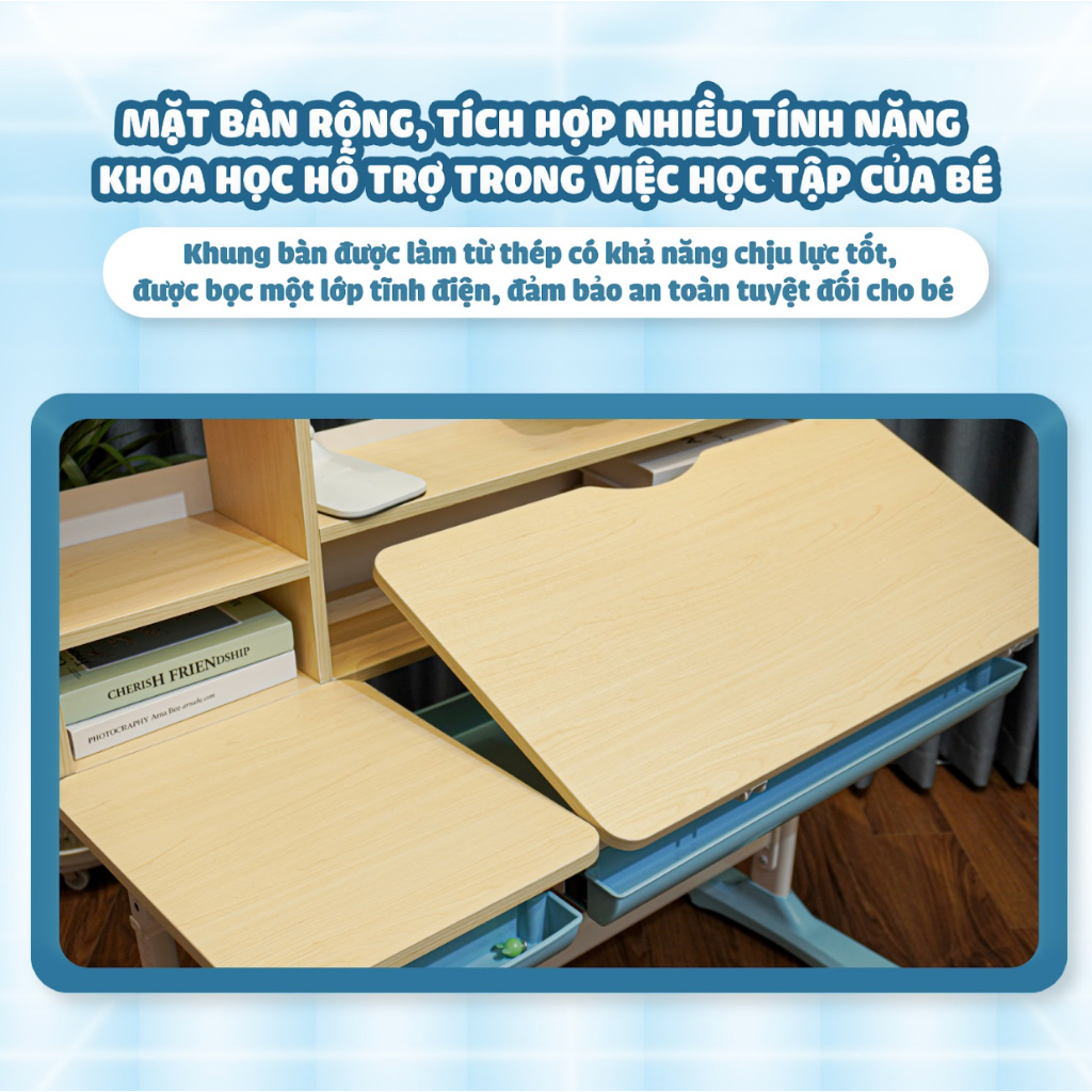 - Khung bàn và ghế làm từ thép tĩnh điện nhập khẩu, đảm bảo an toàn tuyệt đối cho bé.