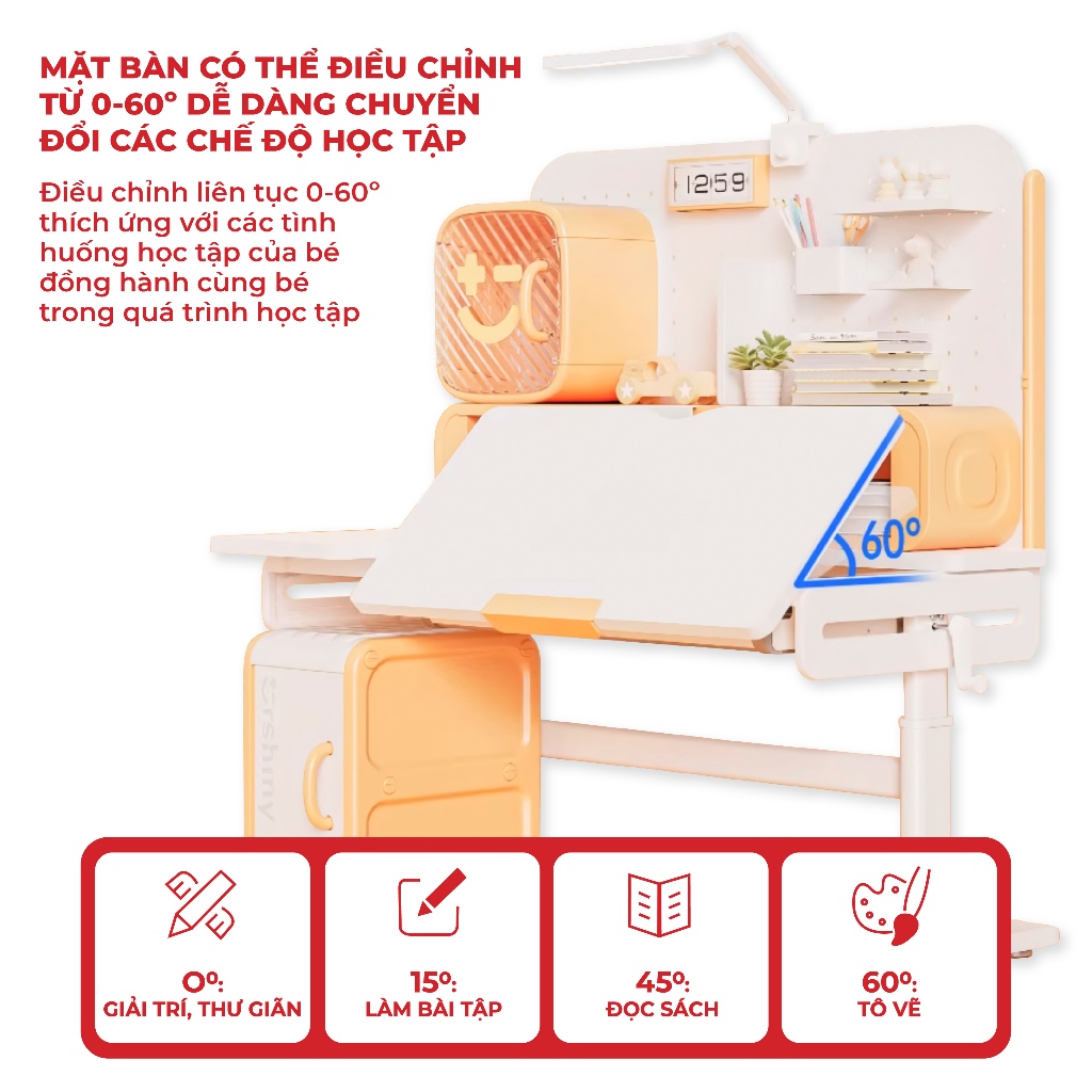 - Điều chỉnh góc nghiêng linh hoạt với dao động từ 0 đến 60 độ, tối ưu khoảng cách từ mắt tới mặt bàn.