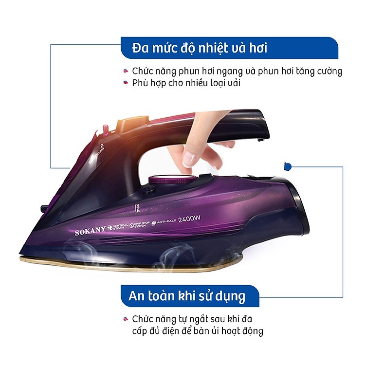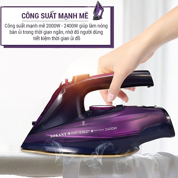 Bàn ủi hơi nước SOKANY mang lại khả năng ủi quần áo nhanh hơn và thẳng hơn nhờ vào luồng hơi nước phun liên tục. Công nghệ hơi nước không gây cháy, không làm bóng bề mặt và làm biến dạng sợi vải nên quần áo sẽ lâu phai màu và bền hơn. Công suất mạnh mẽ 2000W - 2400W giúp làm nóng bàn ủi trong thời gian ngắn, nhờ đó người dùng tiết kiệm thời gian ủi đồ.