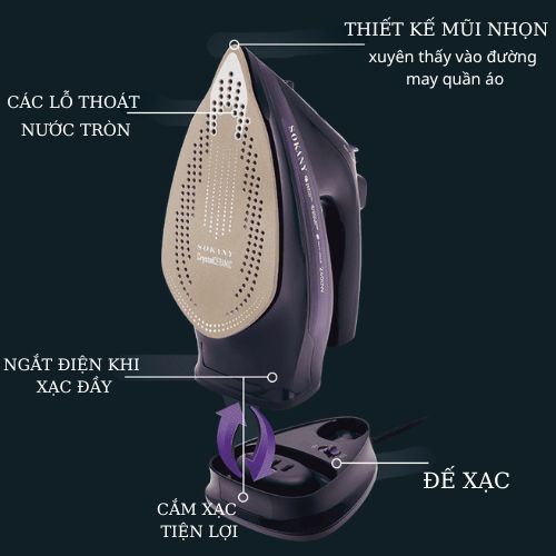 Bàn Ủi Hơi Nước không dây SOKANY 2085 (2400W) với thiết kế đầu bàn ủi mũi nhọn giúp cho việc là ủi các chi tiết nhỏ hẹp trên quần áo một cách dễ dàng hơn. Sản phẩm được lắp đặt với nhiều chức năng là bằng hơi nước tự động giúp làm mịn và bảo vệ bề mặt vải luôn mềm mại và không bị mòn. Tay cầm chắc chắn và được thiết kế chống trượt, nên mang lại cảm giác thoải mái cho người sử dụng.