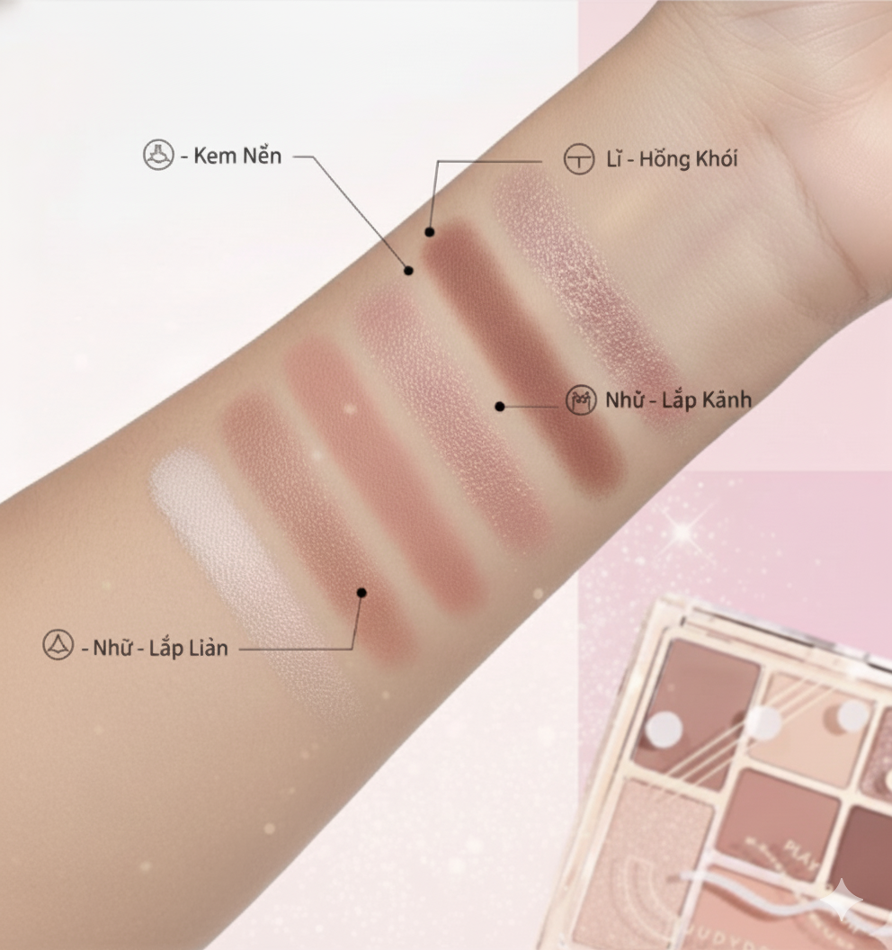 Một trong những điểm nổi bật nhất của bảng phấn mắt Judydoll 17 chính là bảng màu gồm 7 tông đa dạng nhưng lại vô cùng ăn nhập với nhau. Tông màu chủ đạo là hồng khói – sự hòa quyện hoàn hảo giữa sắc hồng nữ tính, nâu đất trầm ấm và ánh khói bí ẩn, tạo nên chiều sâu và sức quyến rũ khó cưỡng cho đôi mắt. Mỗi ô màu đều được sắp xếp khoa học, dễ phối hợp, giúp bạn có thể linh hoạt biến hóa nhiều phong cách khác nhau, từ trang điểm nhẹ nhàng ban ngày cho đến kiểu mắt khói sang trọng buổi tối. Sự kết hợp giữa các sắc độ lì, nhũ và ánh kim mang lại cảm giác thú vị khi sử dụng, giúp bạn tạo hiệu ứng 3D tự nhiên và cuốn hút.