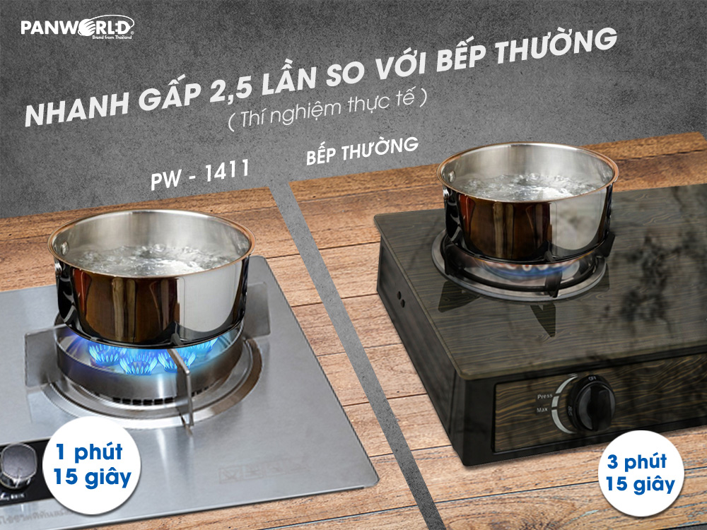 Với thời gian thí nghiệm thực tế cùng đun 2 nồi nước với lượng nước nhất định giữa bếp gas Panworld PW-1411 và bếp thông thường. Kết quả cho thấy, bếp thường mất 3 phút 15s để sôi, trong khi đó bếp gas Panworld PW-1411 chỉ mất khoảng 1 phút 15s.