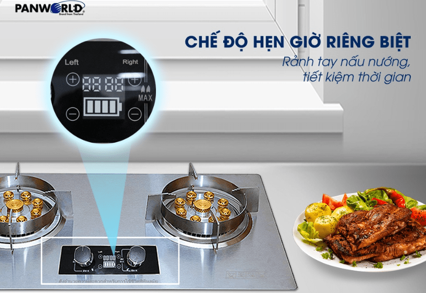 Rất ít bếp gas có tính năng hẹn giờ hiển thị trên màn hình led. Nếu có, giá thành cũng khá cao. Với chế độ hẹn giờ tự động tắt bếp riêng biệt cho 2 vùng nấu, bếp gas hẹn giờ Panworld PW-1411 giúp việc nấu nướng trở nên đơn giản hơn. Người nội trợ có thể rảnh tay tranh thủ làm các công việc nhà khác hoặc trông con trong thời gian nấu nướng mà không lo quá lửa cháy hỏng đồ ăn.