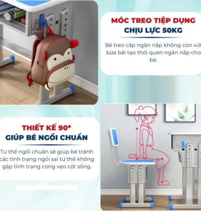 Thiết kế bề mặt bàn rộng rãi mang đến sự tiện lợi cho trẻ khi tham gia hoạt động học tập khác nhau, từ việc viết bài, đọc sách đến vẽ tranh. Điều này giúp bé có thể duy trì tư thế thoải mái nhất, giảm căng thẳng ở cổ và mắt, nhờ vậy mà có thể tập trung học tập lâu hơn mà không bị mỏi mệt. Không chỉ quan tâm đến tư thế ngồi của trẻ, Sakawin S60 còn chú trọng đến chi tiết như phần ghế ngồi với tựa lưng được thiết kế theo đúng cấu trúc cột sống, giúp giảm áp lực cho thắt lưng và cột sống, và phần để chân giúp chân bé luôn được đặt thoải mái, tránh tình trạng tê mỏi khi ngồi lâu.Sản phẩm không chỉ nâng cao hiệu suất học tập mà còn đảm bảo sức khỏe toàn diện cho trẻ, là lựa chọn tuyệt vời cho các ba mẹ quan tâm đến sự phát triển toàn diện của con.
