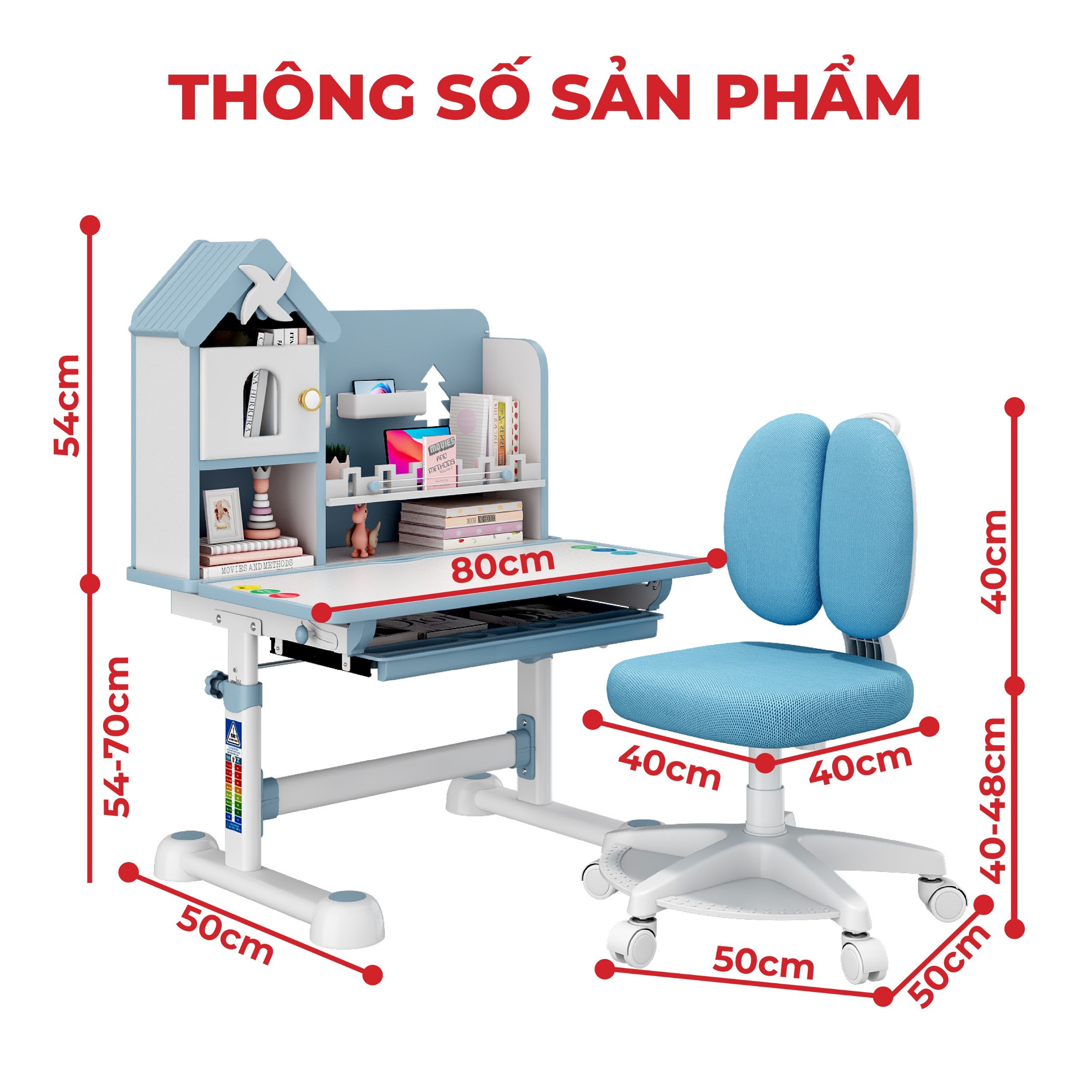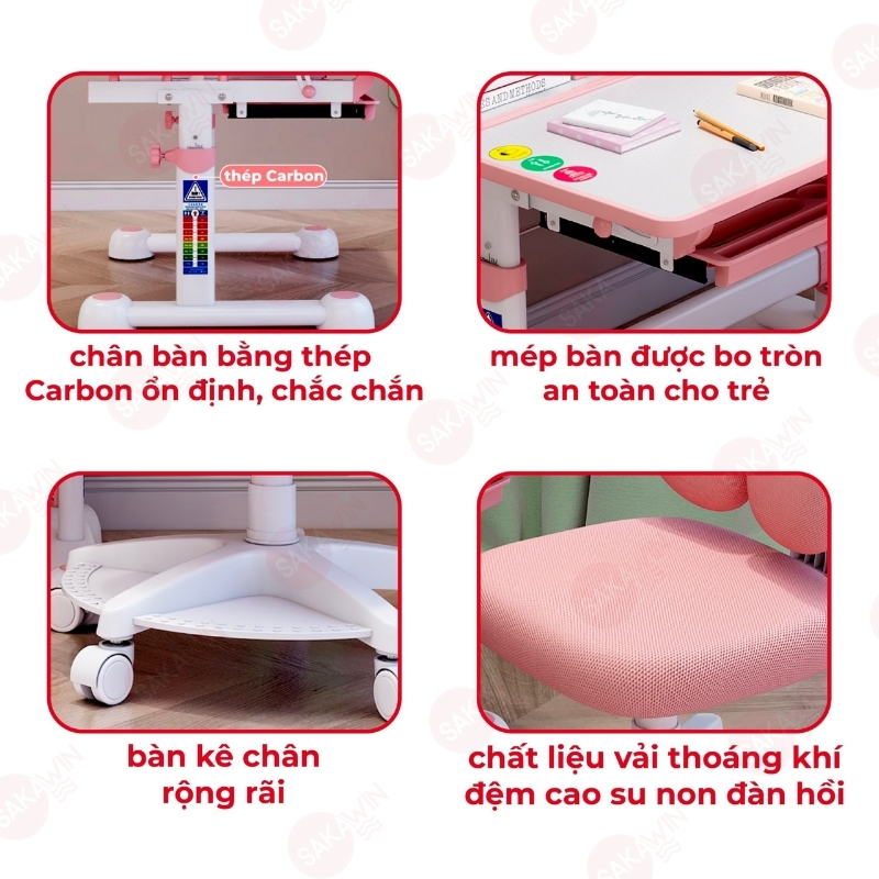 - Chân bàn bằng thép cacbon ổn định, chắc chắn, mép bàn bo tròn an toàn cho trẻ.