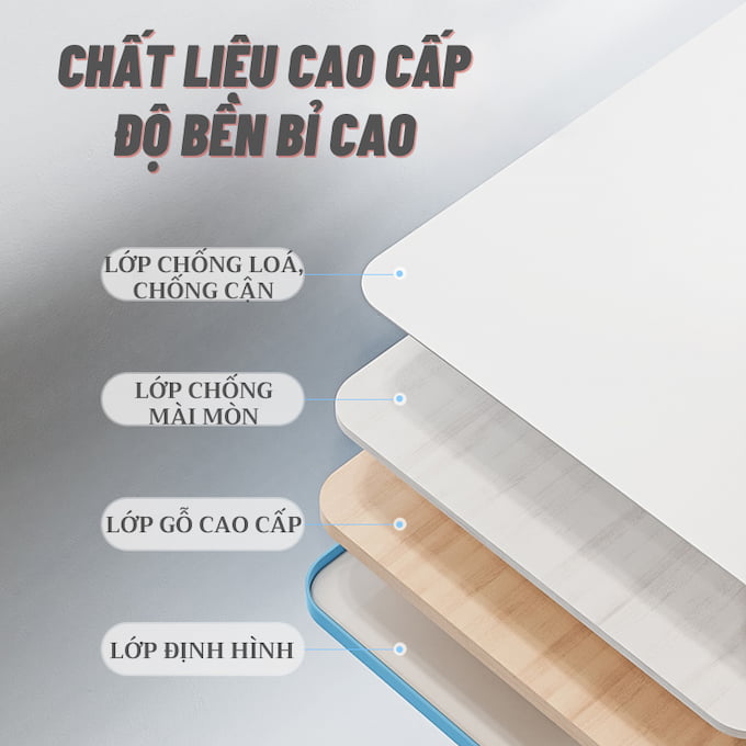 - Chất liệu mặt bàn làm từ gỗ cao cấp, phủ một lớp chống phản chiếu ánh sáng. Sẽ giúp bé ngồi học lâu không có hiện tượng loá mắt, chống cận thị hiệu quả
