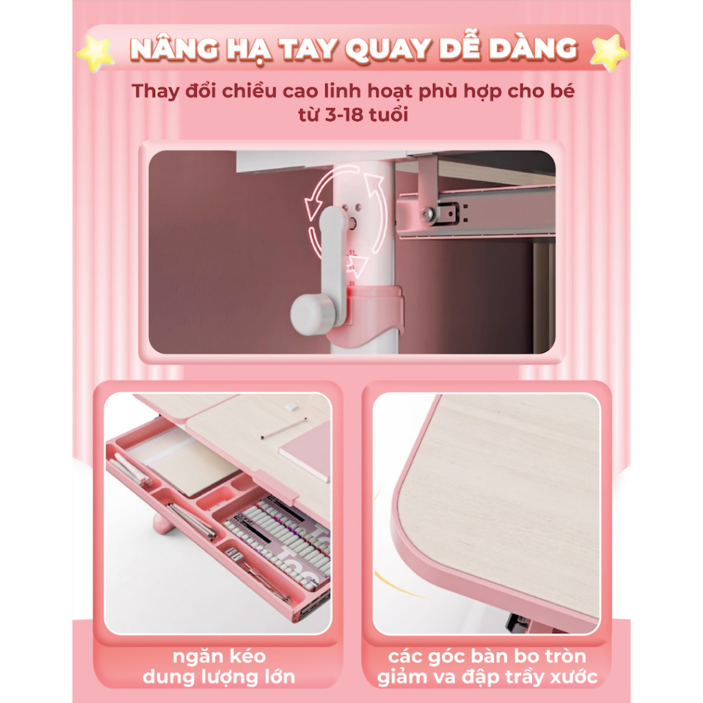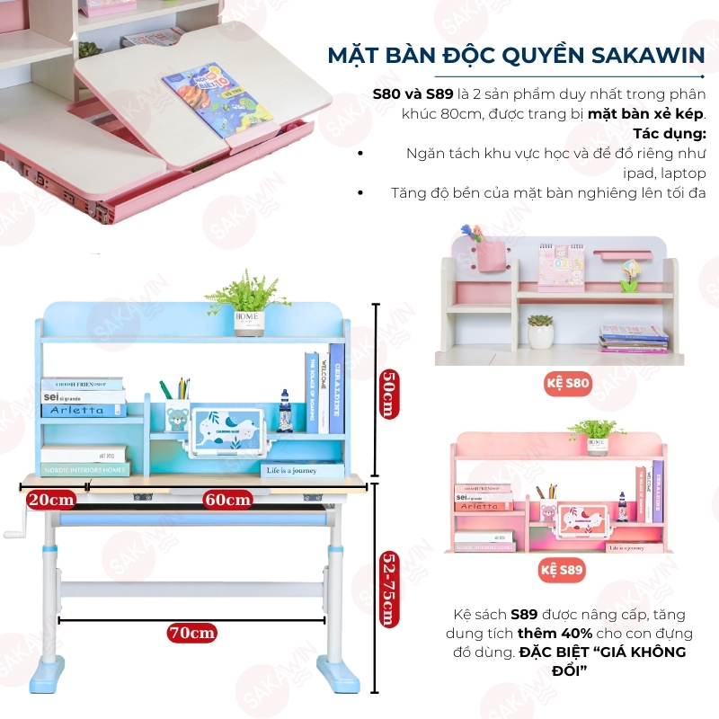 - Bàn học Sakawin S89 cải tiến nâng hạ bằng tay quay, giúp nâng hạ dễ dàng ngay cả bé cũng có thể tự làm