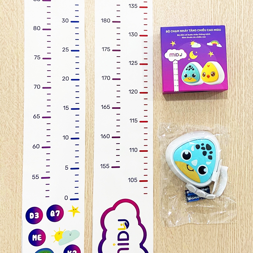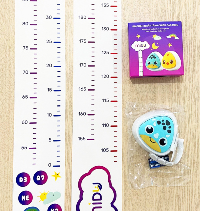 Trong hộp còn có thước đo chiều cao dán tường Midu. Trên thước có các mức chiều cao cố định cùng với khung đo giúp bạn biết được chính xác chiều cao hiện tại của bé yêu để có chế độ ăn uống và hoạt động cho phù hợp với sự phát triển của bé.