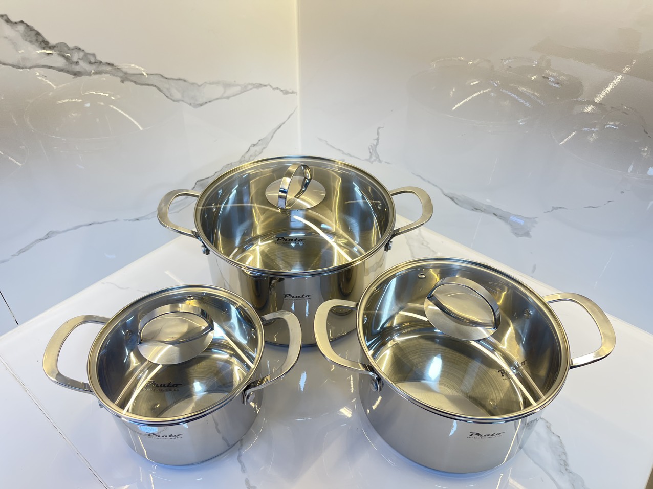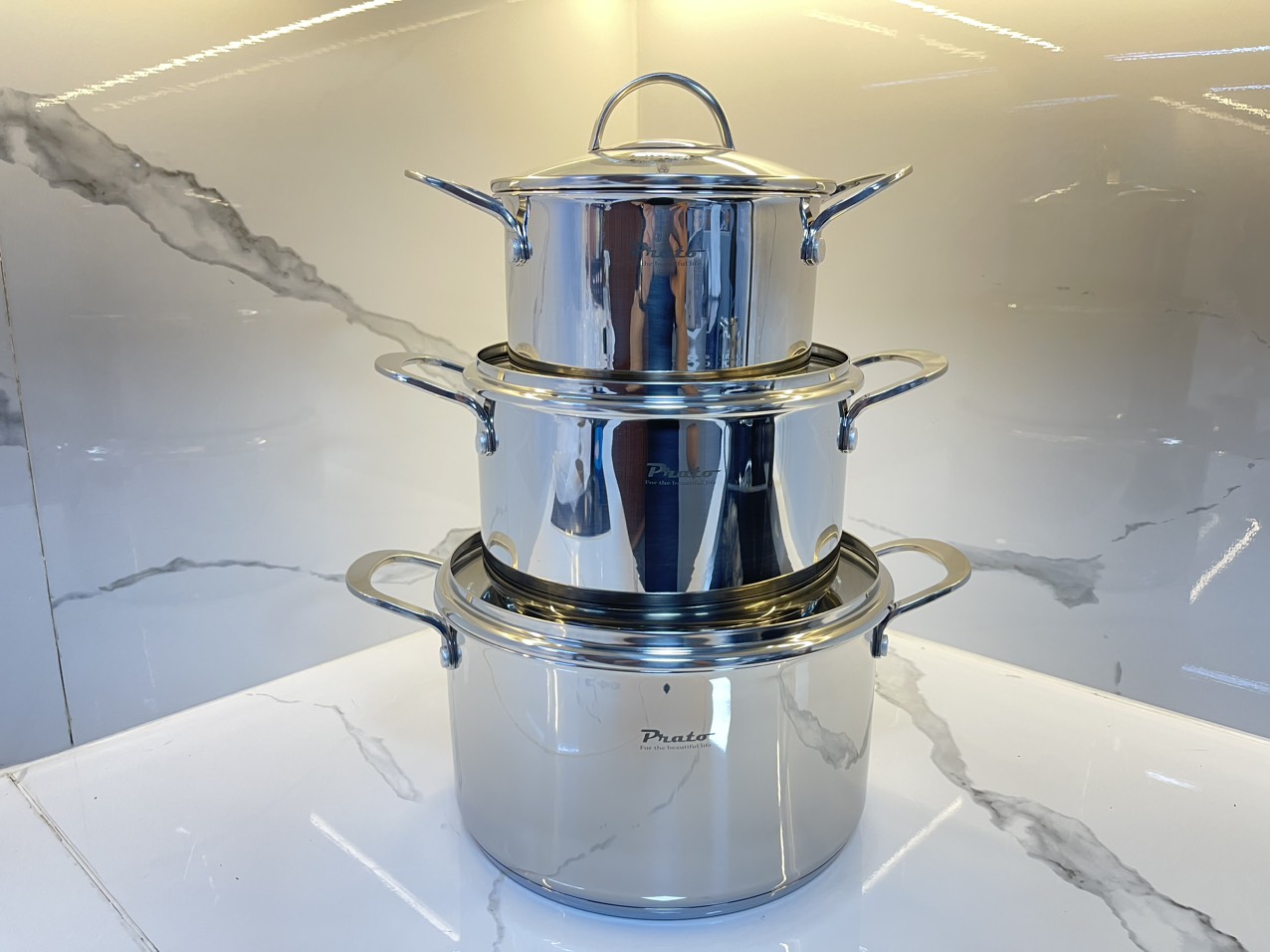 Bộ nồi Prato GOLDEN sử dụng chất liệu thép không gỉ 18/10 không chỉ đảm bảo tính an toàn tiếp xúc thực phẩm mà còn mang lại độ bền vững và khả năng chống ăn mòn cao.