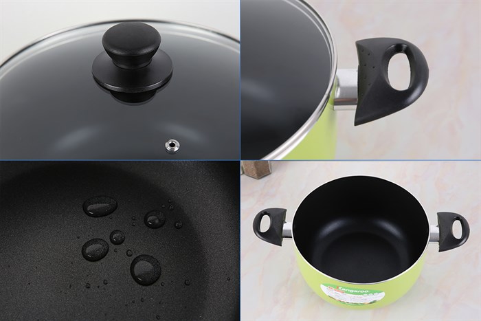 Kangaroo KG993MX được làm từ nhôm có ưu điểm là dẫn nhiệt tốt, nấu chín món ăn nhanh chóng. Bên ngoài được phủ lớp sơn màu xanh chịu nhiệt giúp chống bám bụi bẩn và gia tăng tính thẩm mỹ cho nồi.