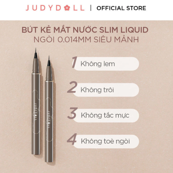 But Ke Mat Nuoc JUDYDOLL Net Sieu Manh Chong Nuoc Lau Troi 0014mm Slim Liquid Eyeliner JudyDoll Julido Beauty la san pham trang diem mat chat luong cao tu thuong hieu JUDYDOLL noi tieng cua Trung Quoc. Voi thiet ke dau co sieu manh chi 0014mm san pham giup ban ve duoc nhung duong ke mat sac net tinh te va chinh xac nhat phu hop cho ca nguoi moi bat dau va chuyen nghiep. But ke mat nuoc nay co cong thuc len mau nhanh khong lem va giu duoc mau suot ca ngay dam bao lop trang diem ben vung du trong dieu kien thoi tiet am uot hay hoat dong nhieu. Trong luong chi 04g but nho gon de dang mang theo trong tui xach hoac vi ca nhan tro thanh cong cu khong the thieu trong bo suu tap my pham cua ban.