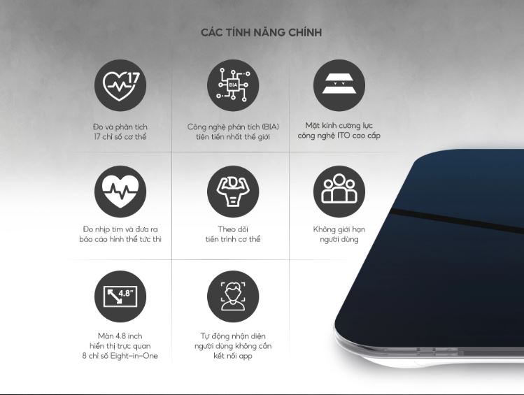 - NGƯỜI DÙNG KHÔNG GIỚI HẠN: Cân thân thiện với nhiều người dùng, có khả năng tự động lưu trữ và nhận diện người dùng một cách thông minh, phù hợp theo dõi sức khoẻ cho cả gia đình, nhóm tập luyện hay câu lạc bộ
