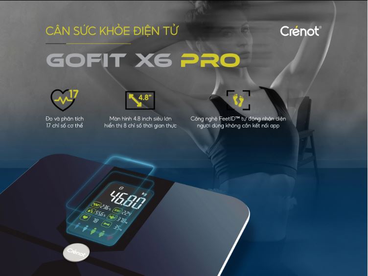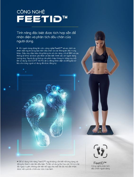 - CÔNG NGHỆ FEETID™ NHẬN DIỆN NGƯỜI DÙNG MÀ KHÔNG CẦN KẾT NỐI APP: Công nghệ FeetID™ trên cân sức khỏe điện tử Crénot GOFIT X6 Pro là một tính năng đặc biệt được tích hợp sẵn để nhận diện và phân tích dấu chân của người dùng. Từ lần sử dụng thứ hai, cân hỗ trợ chế độ ngoại tuyến, không cần kết nối cho mỗi lần đo mà vẫn nhận được kết quả đo chính xác trên màn hình