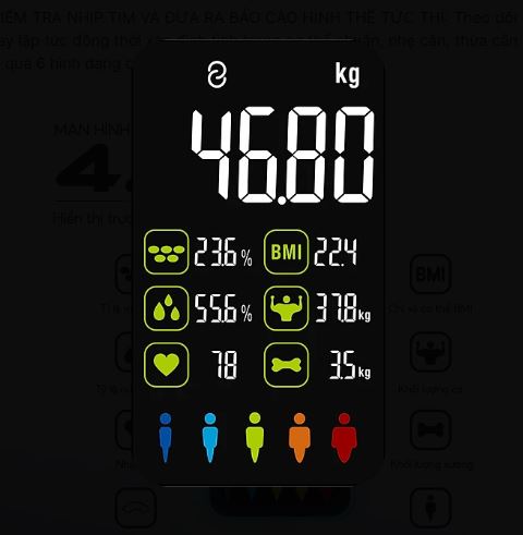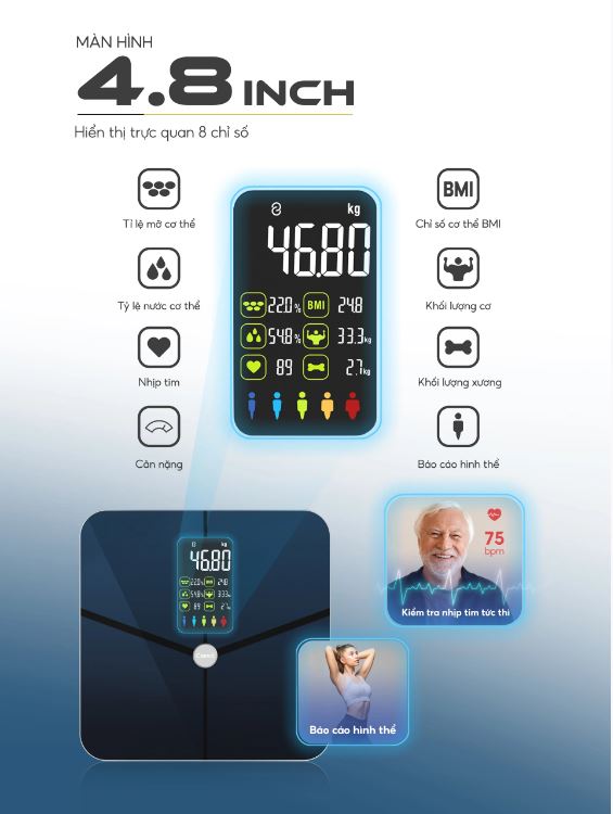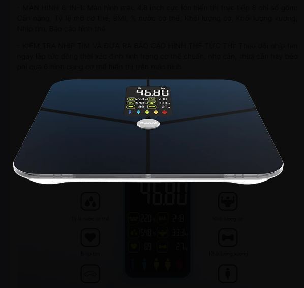 - MÀN HÌNH 8-IN-1: Màn hình màu 4.8 inch cực lớn hiển thị trực quan 8 chỉ số gồm: Cân nặng, Tỷ lệ mỡ trong cơ thể, BMI, % nước cơ thể, Khối lượng cơ, Khối lượng xương, Nhịp tim, Báo cáo hình thể