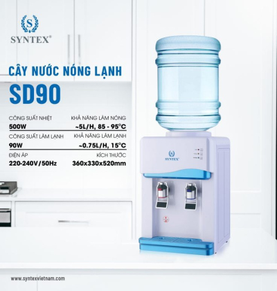 Cây nước nóng lạnhsử dụng hệ thống làm lạnh bằng chip với gas lạnh R134A cho khả năng làm lạnh nước sâu hơn, độ bền cao hơn và tiết kiệm điện năng hơn chip điện tử.Làm nóng lạnh nhanh Cây nước nóng lạnh SyntexSD90 có công suất làm nóng 550W, đạt năng suất 5 lít/giờ với nhiệt độ làm nóng từ 85 - 95 độ C, nhiệt độ làm lạnh 15 độ C, giúp mang đến cho người dùng nước nóng, nước lạnh dồi dào sử dụng để pha mì, sữa, trà, uống giải khát tiện lợi.Tính an toàn cao Cây nước nóng được tích hợp công nghệ chống đun khô kép, khóa an toàn trên vòi nước nóng và tự ngắt điện khi bình chứa hết nước sẽ đảm bảo an toàn khi sử dụng, kéo dài độ bền dài lâu.