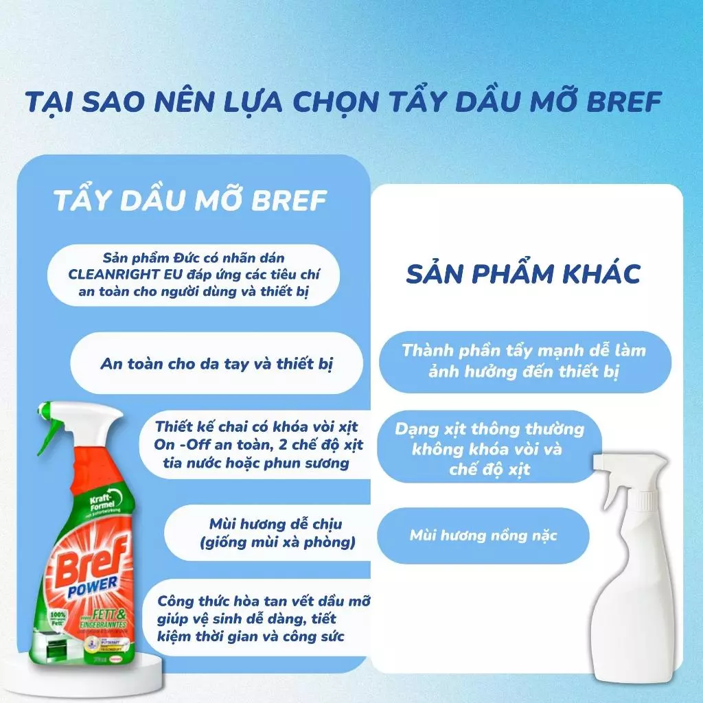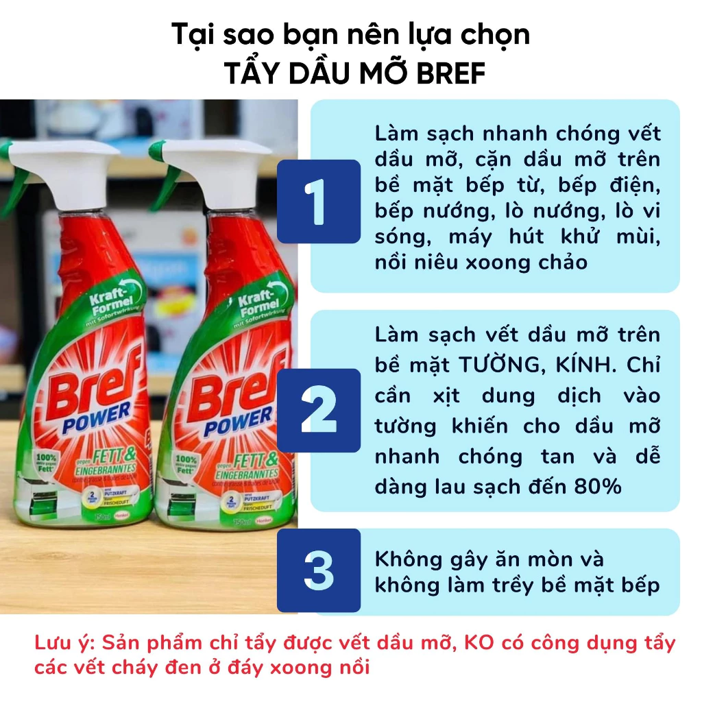 Bình xịt tẩy rửa đa năng Bref Power với công thức mới tân tiến và độc đáo đánh bay ngay lập tức các vết bẩn cứng đầu do dầu mỡ, bồ hóng, nhọ xoong, chất béo, vết bám cháy, chất nhờn , bụi bẩn gây ra. siêu sạch