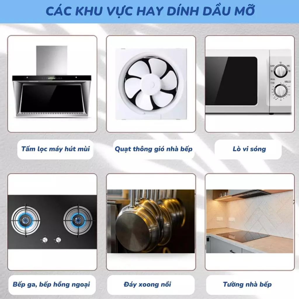 Chuyên gia xử lý các vết dầu mỡ, vết bám bẩn trên thiết bị nhà bếp. Loại bỏ tức thì các vết bám bẩn, dầu mỡ trên bề mặt bếp từ, bếp điện, bếp nướng, lò nướng, lò vi sóng, máy hút khử mùi, nồi niêu xoong chảo, các vết dầu mỡ trên tường bếp, tường kính nhà bếp mà không gây ăn mòn và làm trầy xước bề mặt vệ sinh.