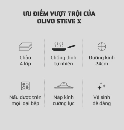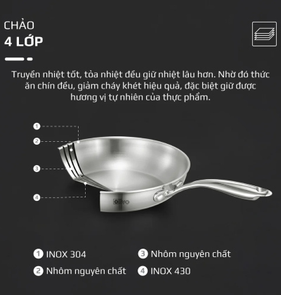 Cấu tạo 4 lớp inox – nhôm – inox cao cấp, giúp dẫn nhiệt nhanh, tỏa đều khắp đáy và thành chảo, hạn chế cháy khét và giữ hương vị nguyên bản của thực phẩm.