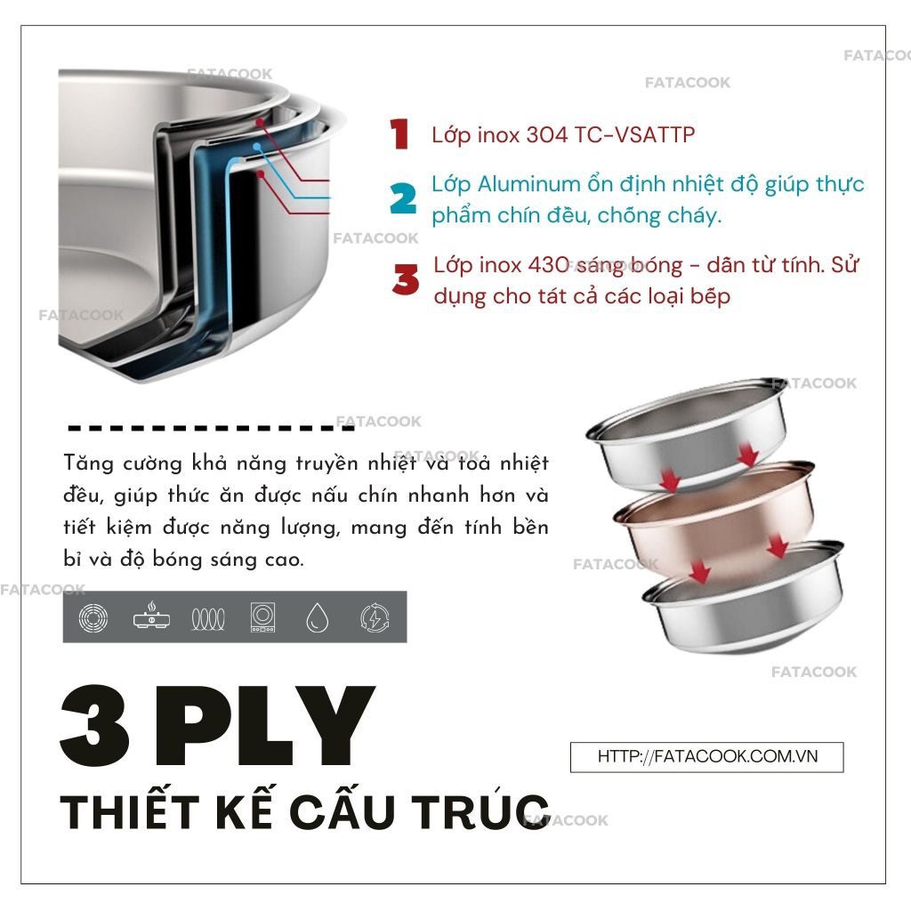CHỐNG OXI HÓA CAO Chảo xào Fatacook sử dụng chất liệu lớp trong cùng là inox 304 cao cấp an toàn cho thực phẩm. Inox 304 được khẳng định là hợp kim inox tuyệt vời, có khả năng chống oxi hóa cao. Hợp kim này hoàn toàn không thôi nhiễm các chất độc hại vào thức ăn, có khả năng chống bám bẩn tối ưu và tuyệt đối an toàn cho sức khỏe. Công nghệ mới 3 lớp liền thân.