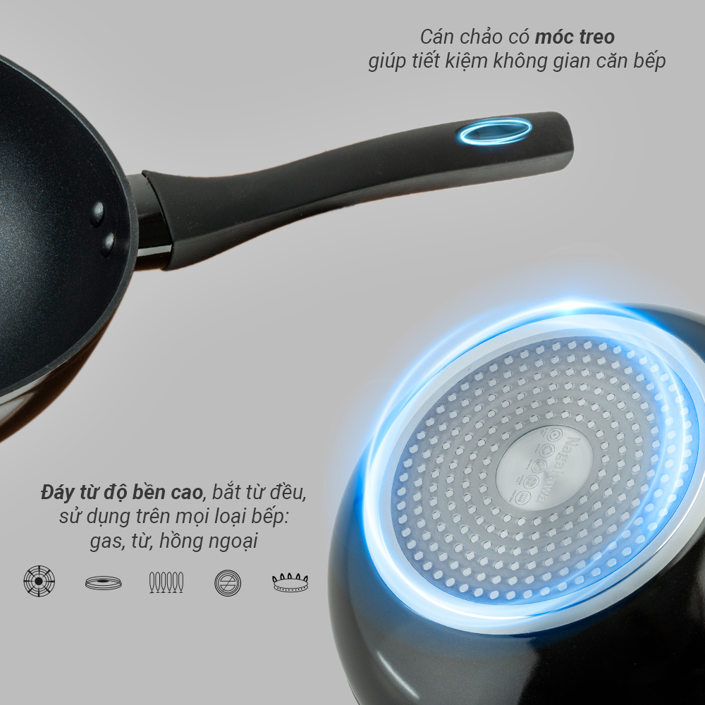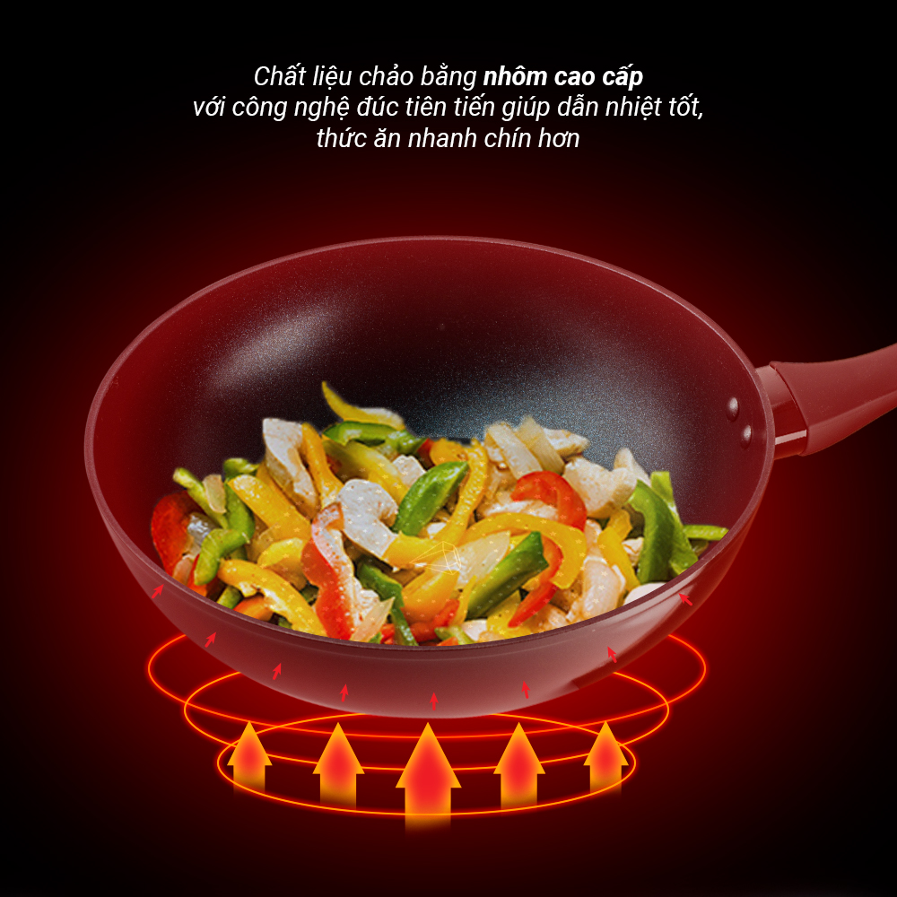 - Chất liệu: Nhôm cao cấp, phủ 5 lớp chống dính Teflon, tay cầm bằng nhựa Bakelite siêu bền