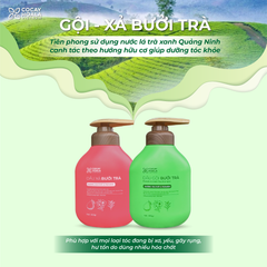 | Thành phần chính | Chiết xuất lá trà xanh Vỏ bưởi khô Dầu hoa anh thảo Keratin thủy phân Vitamin B5 - Thành phần có chứng nhận hữu cơ được sử dụng trong công thức của Dầu gội Bưởi Trà: Decyl Glucoside, Caprylic triglyceride, tinh dầu hạt cải - Thành phần có chứng nhận hữu cơ được sử dụng trong công thức của Dầu xả Bưởi Trà: Bơ hạt mỡ, Caprylic triglyceride, tinh dầu hạt cải |