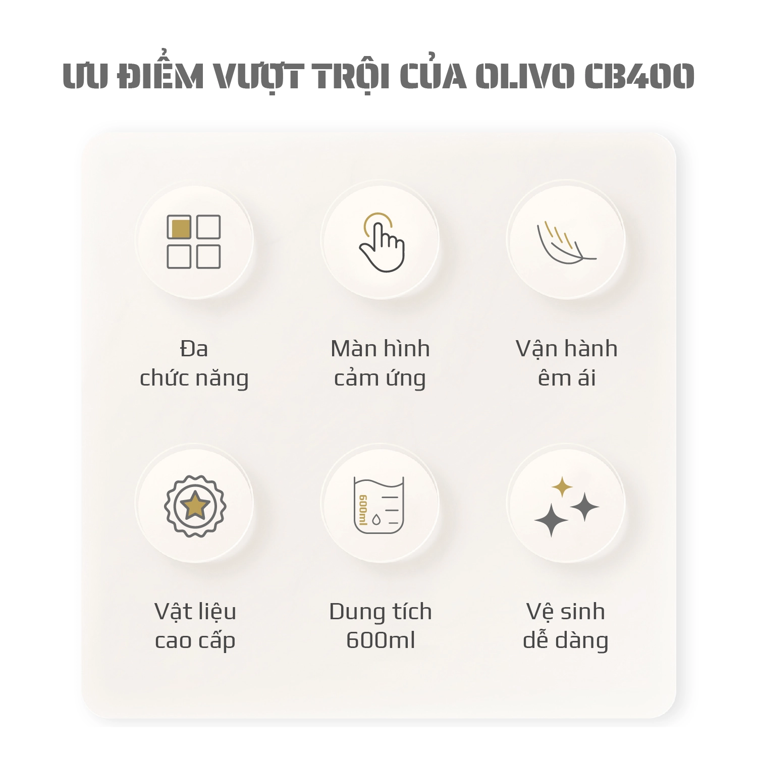 1. Máy xay nấu đa năng Olivo CB400Máy xay nấu đa năng Olivo CB400 Pro tích hợp chức năng xay và nấu trong cùng một thiết bị, giúp chế biến nhanh các món như cháo, súp, sinh tố, sữa hạt hoặc các món ăn xay nấu đơn giản. Máy vận hành ổn định, xay nhuyễn mịn và nấu chín đều, giúp giữ được hương vị tự nhiên của thực phẩm. Thiết kế nhỏ gọn giúp tiết kiệm diện tích bếp và thuận tiện mang theo khi cần.