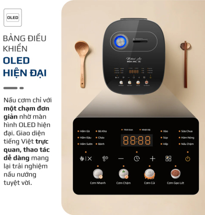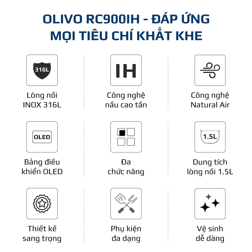 4. BẢNG ĐIỀU KHIỂN OLEDNồi cơm điện cao tần OLIVO RC900IH được trang bị bảng điều khiển cảm ứng OLED hiện đại với giao diện thân thiện, dễ thao tác. Mọi chức năng được hiển thị rõ ràng, phù hợp với mọi lứa tuổi sử dụng, đặc biệt là người lớn tuổi.5. 18 CHẾ ĐỘ NẤU CÀI SẴNNồi cơm điện cao tần OLIVO RC900IH được tích hợp18 chế độ cài đặt sẵn, giúp bạn dễ dàng chế biến các món ăn yêu thích mà không cần tốn thêm bất kỳ dụng cụ nấu bếp nào khác.Có tới
