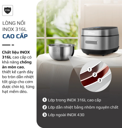 1.LÒNG NỒI INOX 316L CAO CẤP AN TOÀNMột trong những yếu tố quan trọng nhất khi chọn nồi cơm điện chính là chất liệu lòng nồi, bởi nó ảnh hưởng trực tiếp đến sức khỏe và hương vị món ăn. Nồi cơm điện cao tầnOLIVO RC900IHsử dụng lòng nồi làm từINOX 316L, loại vật liệu cao cấp có độ bền vượt trội, chống ăn mòn và chịu nhiệt cực kỳ tốt.