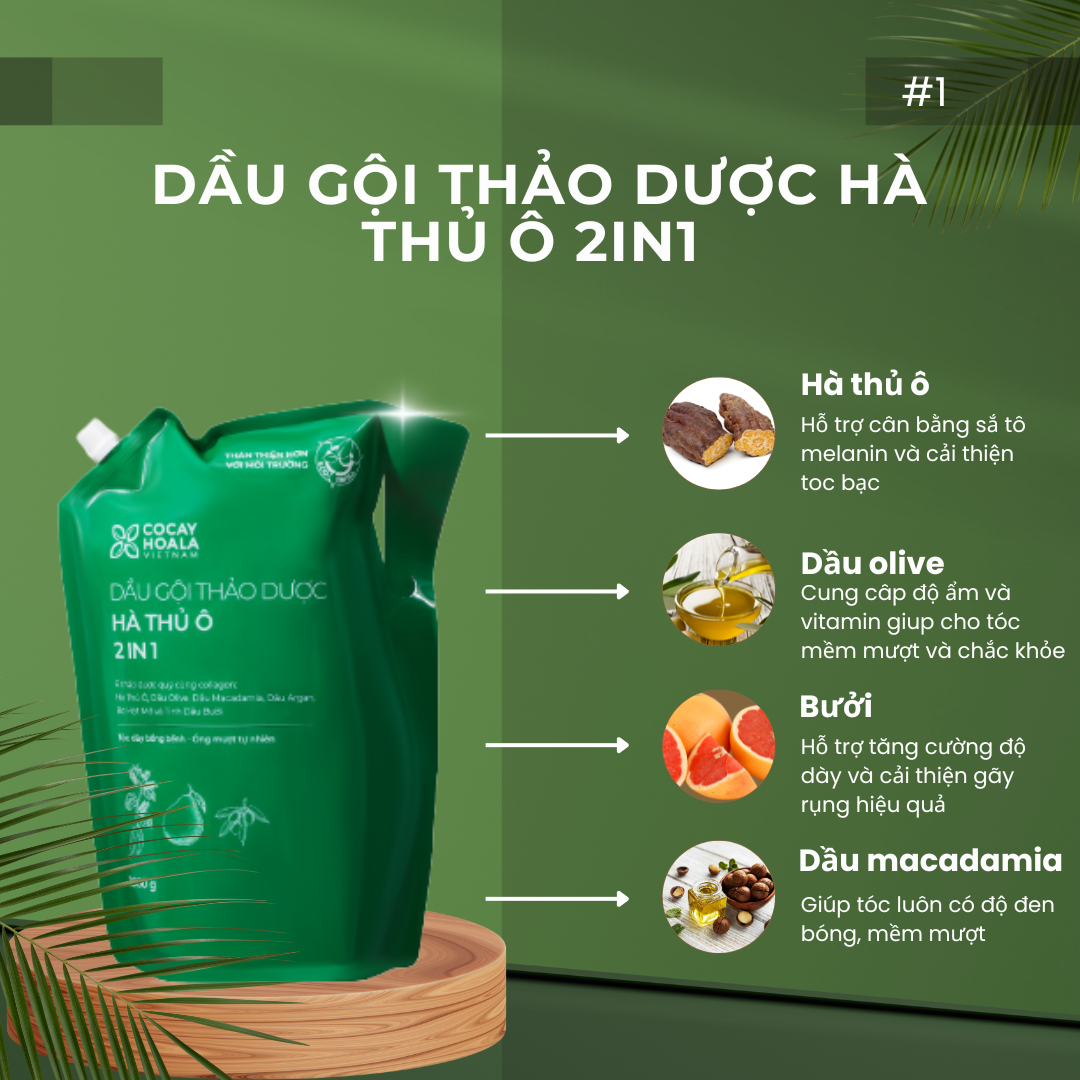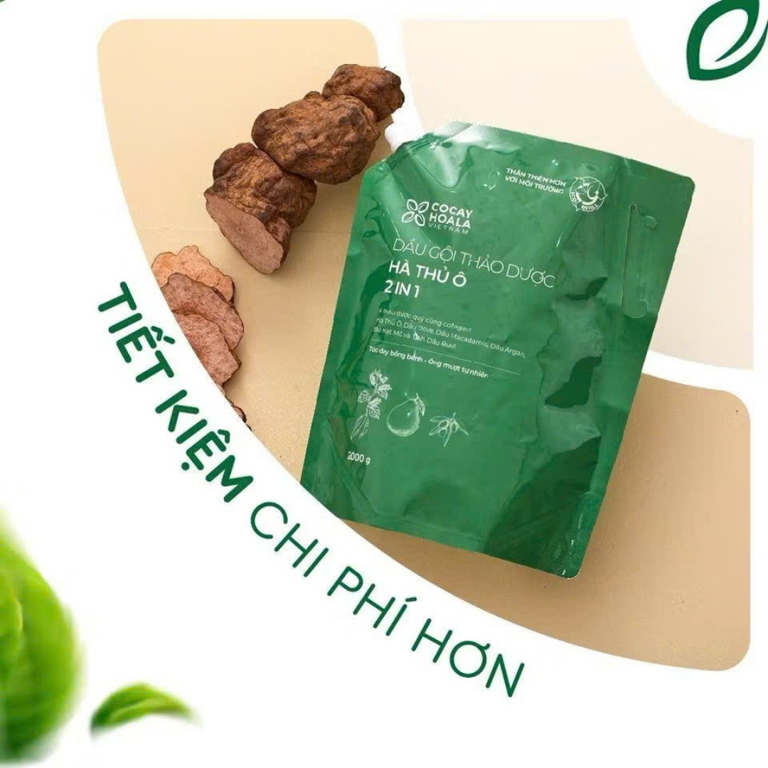 8. Thông tin sản phẩm Tên sản phẩm: Dầu Gội Thảo Dược Hà Thủ Ô 2in1 Cỏ Cây Hoa Lá Dung tích: 2000g (dạng túi refill) Thành phần chính: Hà Thủ Ô, Bồ Kết, Gừng, Tinh Dầu Bưởi, Lô Hội, Vitamin E Công dụng: Làm sạch da đầu, giảm gãy rụng, kích thích mọc tóc, dưỡng tóc đen mượt và chắc khỏe Hạn sử dụng: 3 năm kể từ ngày sản xuất (xem trên bao bì) Sản xuất bởi: Thương hiệu Cỏ Cây Hoa Lá – Việt Nam Tiêu chuẩn sản xuất: GMP – an toàn, lành tính, phù hợp sử dụng hằng ngày