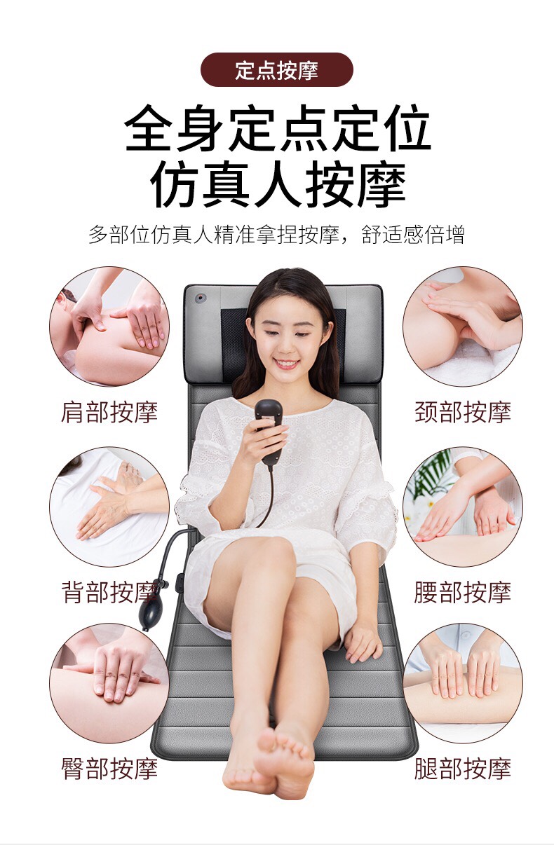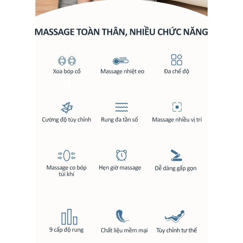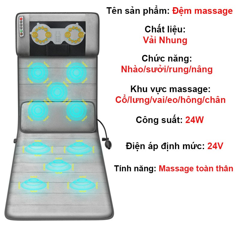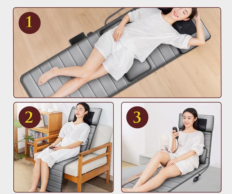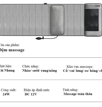 Đệm massage toàn thân sản xuất theo công nghệ Italy đáp ứng tiêu chuẩn Châu Âu với tổng cộng 9 chế độ massage và 10 động cơ rung giúp bạn massage 11 vị trí trên cơ thể, đánh tan mệt mỏi, thư giãn sau 1 ngày làm việc mệt mỏi.