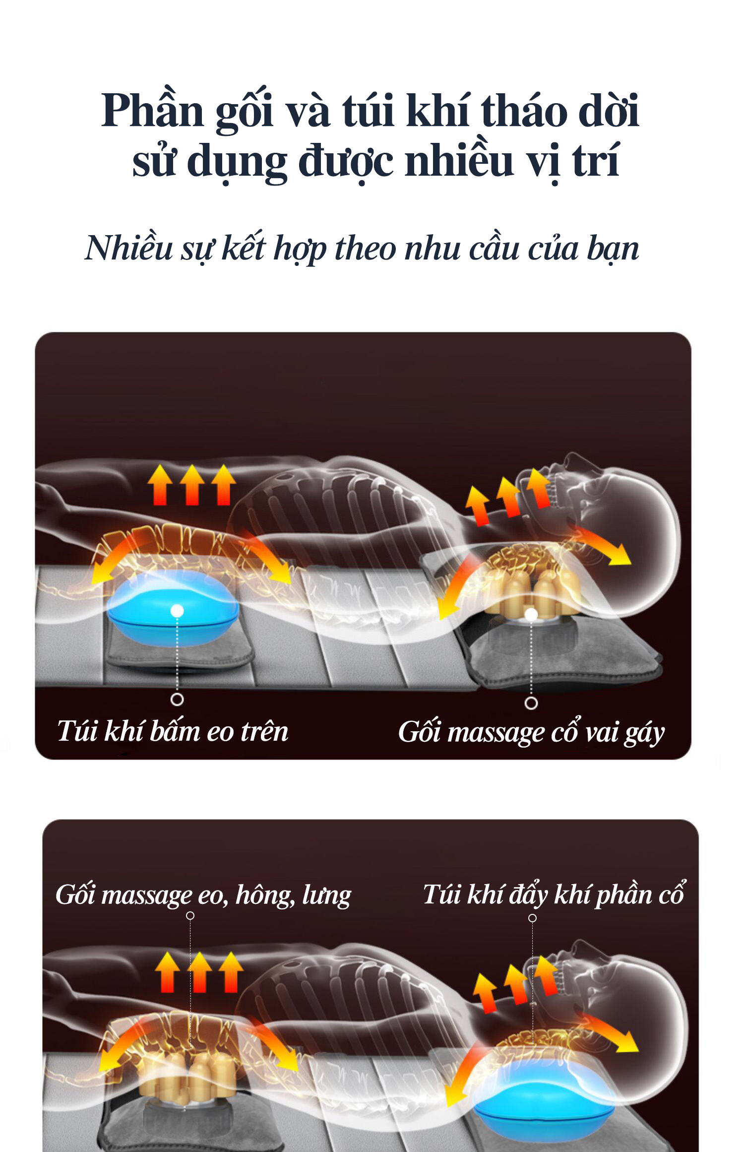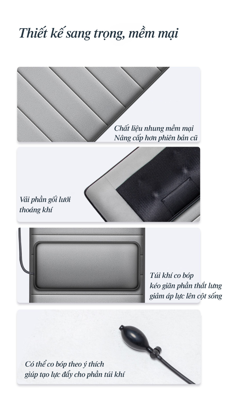 Đặc biệt có túi khí tạo lực đẩy kéo giãn phần thắt lưng, giảm áp lực lên cột sống, giảm sự chèn ép thần kinh, tăng lưu thông tuần hoàn máu.