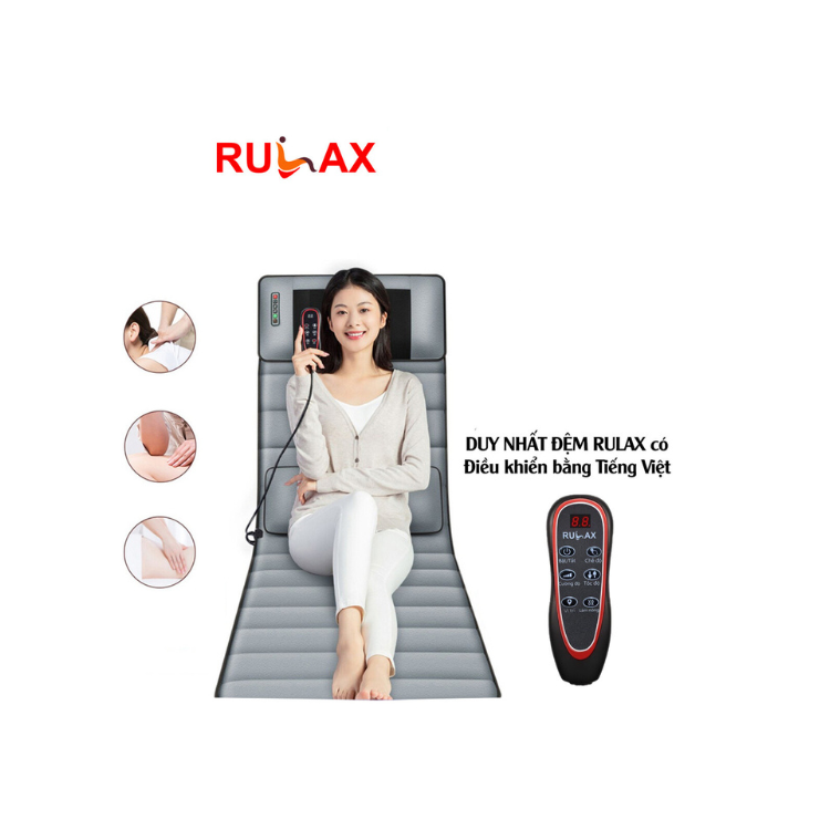 Đệm massage RULAX có chế độ massage hồng ngoại trải đều từ đầu đến chân ( 10 điểm mát xa rung,có thể mát xa nhẹ nhàng cho cổ vai gáy, lưng,eo,hông,chân,...), hỗ trợ giảm đau cơ bắp, giải tỏa stress và khôi phục năng lượng.