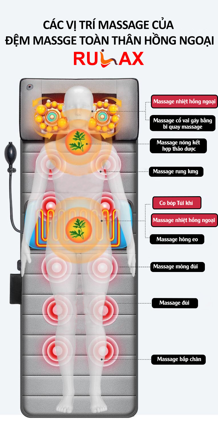 Đệm massage toàn thân hồng ngoại RULAX RL05 với chức năng vượt trội đa điểm rung, giúp bạn thư giãn toàn bộ cơ thể, massage nhiều vị trí trải dài từ đầu xuống chân