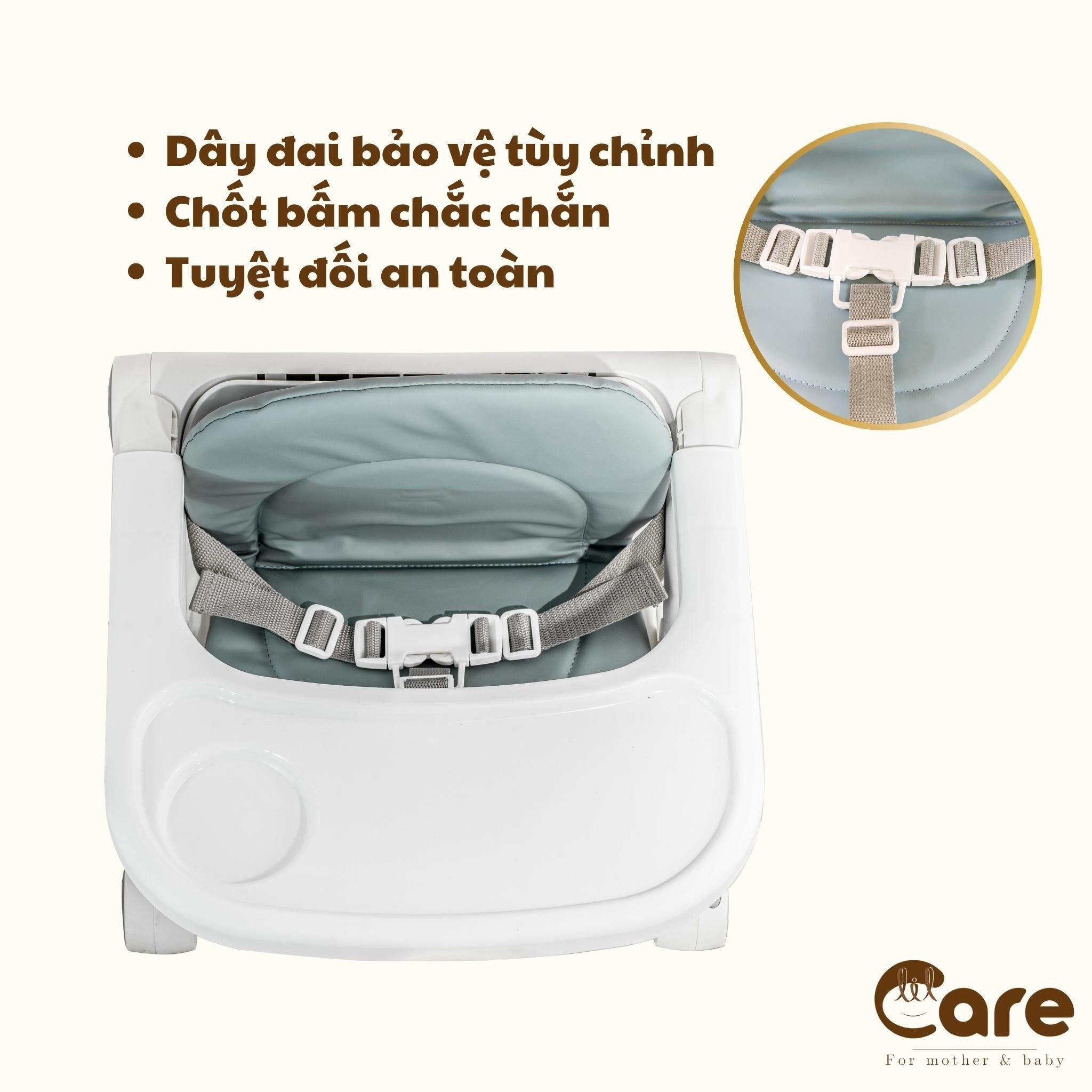 -Dây đai bảo vệ kết hợp cùng chốt bấm chắc chắn đảm bảo sự an toàn cho bé khi ngồi trên ghế.