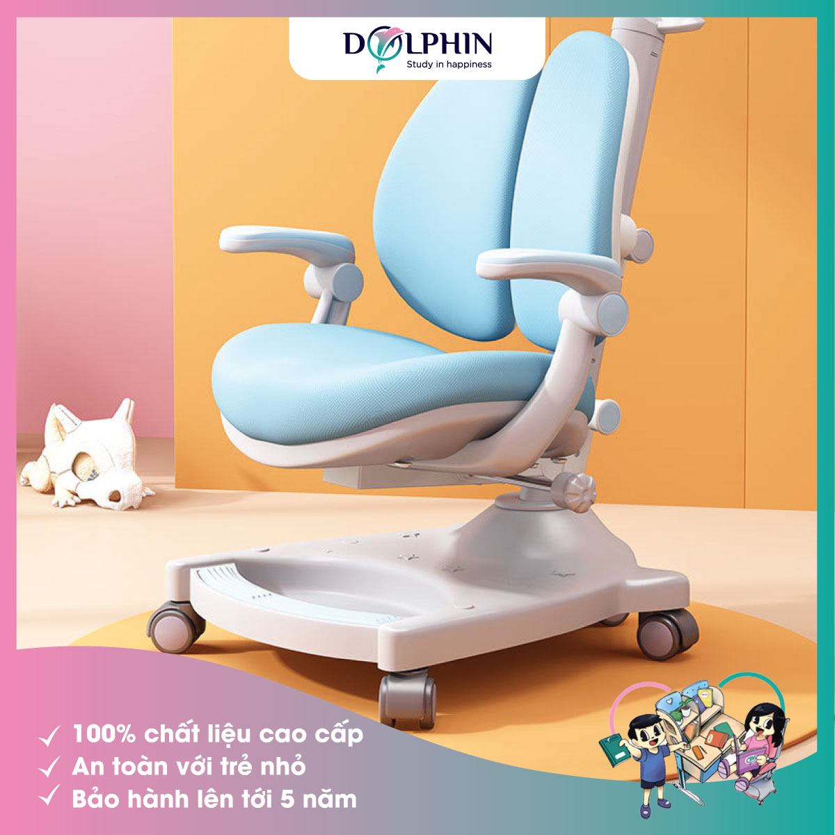 Cấu trúc chân ghế vững chãi theo nguyên lý ngũ hành, có chỗ để chân thuận tiện cho bé, không bị mỏi, chỗ để chân dài hơn đệm ngồi, đảm bảo góc 90 độ để bé phát triển khỏe mạnh