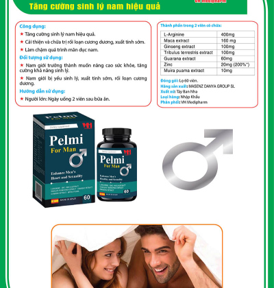Để giải quyết những vấn đề trên hôm nay tôi muốn giới thiệu đến các bạn sản phẩm Thực phẩm bảo vệ sức khỏe PELMI giúp tăng cường sinh lý nam hiệu quả, phòng chống rối loạn cương dương và xuất tinh sớm. Với những thành phần như: L-arginine, Chiết xuất Maca (Lepidium meyenii), Chiết xuất Nhân sâm (Panax Ginseng), Chiết xuất Bạch Tật Lê (Tribulus terrestris), Chiết xuất Guarana (Paullinia cupana), Kẽm, Chiết xuất Muira puama (Ptychopetalum olacoide).![]()