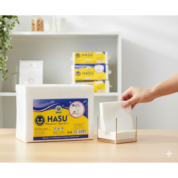 Hasu cam kết sử dụng bột giấy nguyên sinh, không pha tạp và không dùng hóa chất tẩy trắng độc hại. Nhờ vậy, giấy giữ được độ trắng tự nhiên, mềm mại và an toàn cho da, kể cả da nhạy cảm hoặc trẻ nhỏ.