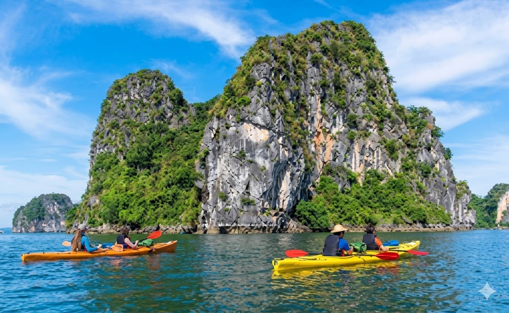Du khách có thể trải nghiệm chèo kayak hoặc thuyền nan khám phá làng chài.