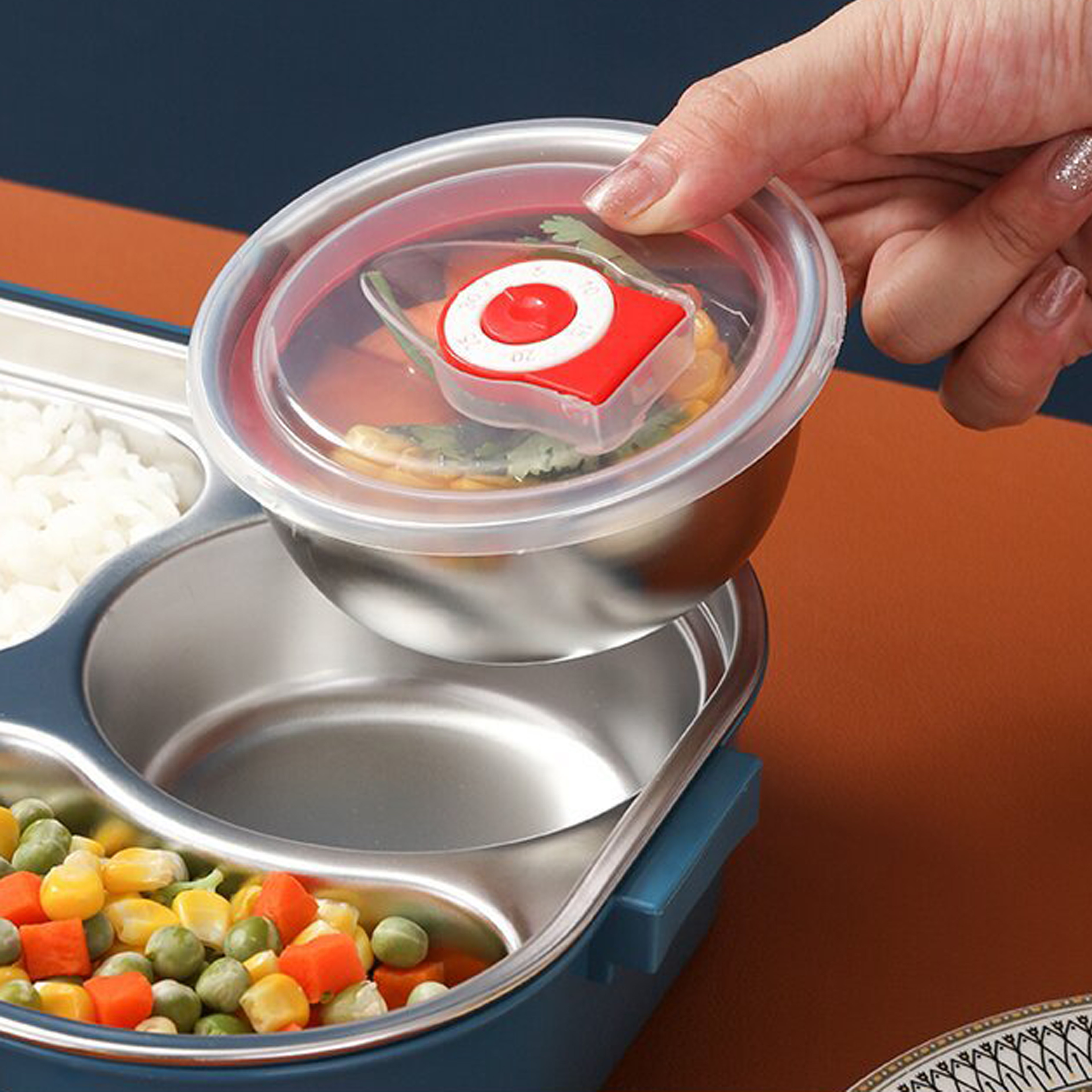 - Bộ hộp cơm giữ nhiệt bao gồm: 1 nắp và vỏ nhựa PP 05, 1 khay inox 304 - bốn ngăn, 1 bát canh inox 304 bọc nhựa chống nóng