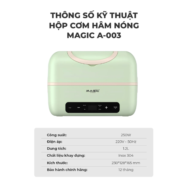 Hộp cơm Magic A-003 còn hỗ trợ nấu cơm đa dạng, có thể dùng để hấp rau củ, nấu cháo, hay hâm nóng thức ăn. Với chất lượng bền bỉ, an toàn và tiện lợi, sản phẩm này sẽ là người bạn đồng hành đáng tin cậy trong gian bếp của bạn.