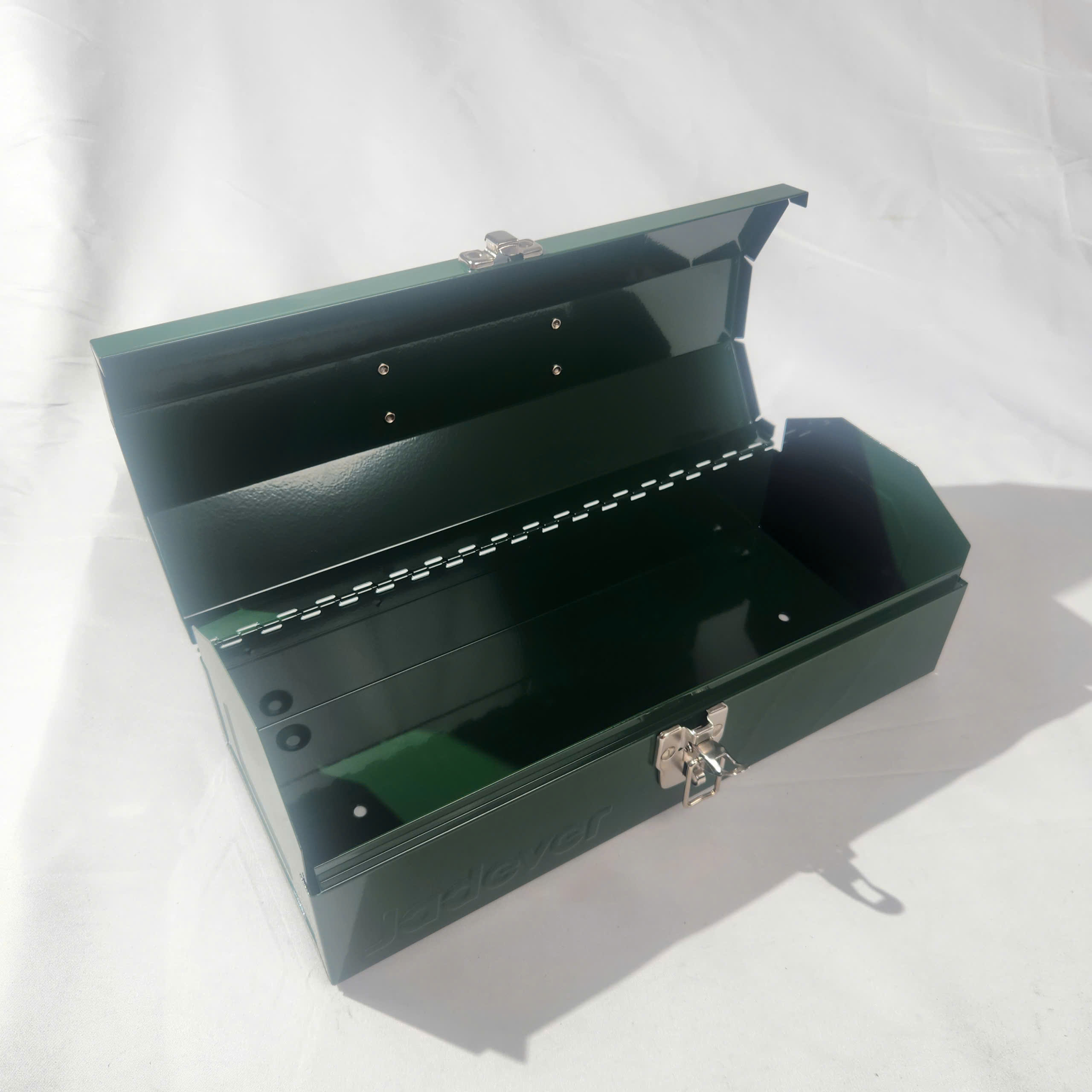 - Hộp được chế tạo từ vật liệu kim loại cứng cáp, có khả năng bảo vệ tốt các dụng cụ bên trong khỏi va đập nhẹ trong quá trình sử dụng và di chuyển. Kết cấu hộp ổn định giúp hạn chế tình trạng móp méo, đảm bảo sử dụng lâu dài.