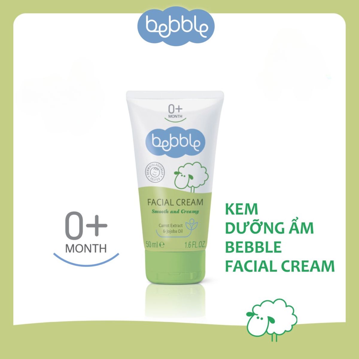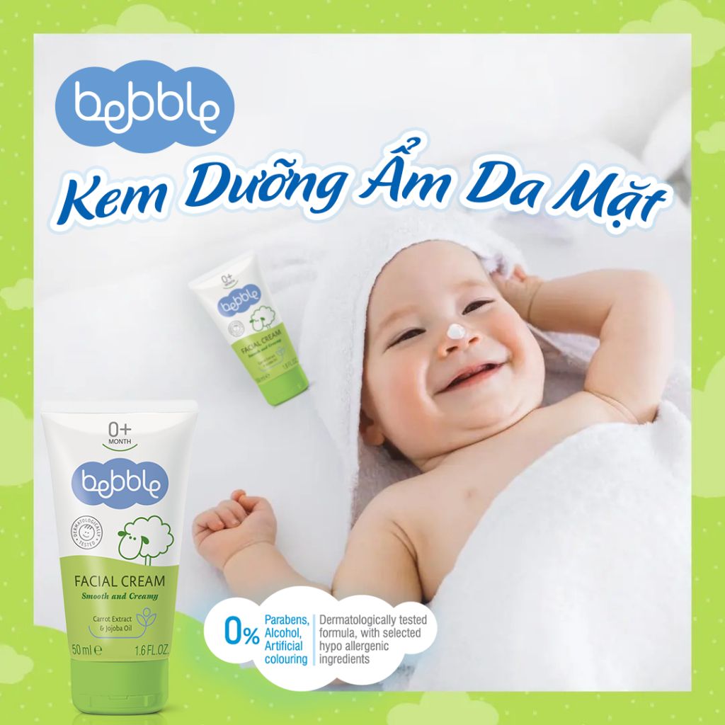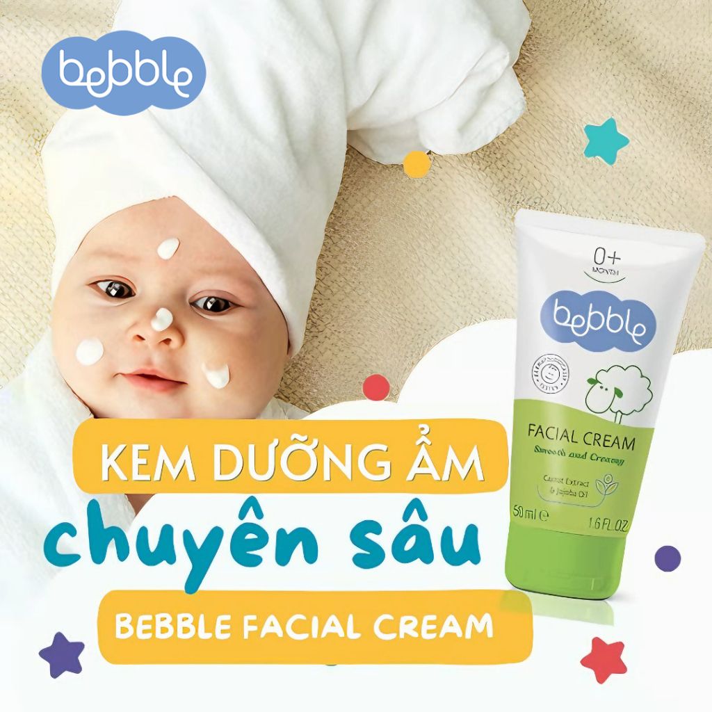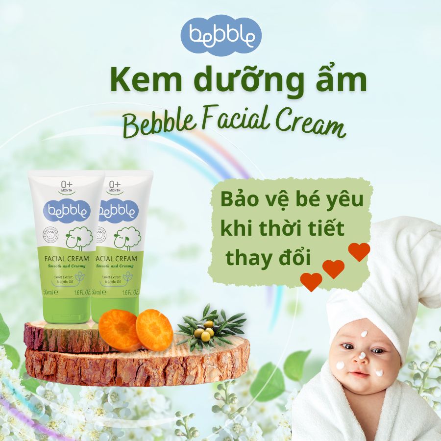 - Kem dưỡng ẩm Bebble Facial Cream 50ml là sự kết hợp của 6 loại dầu tự nhiên, bao gồm: tinh dầu Jojoba, dầu oliu, dầu hạnh nhân ngọt, dầu đậu nành, dầu hướng dương và bơ hạt mỡ. Nhờ thế, sản phẩm có khả năng cung cấp nhiều dưỡng chất cho da như các vitamin A và E, đồng thời kháng viêm và ngăn chặn vi khuẩn hiệu quả.