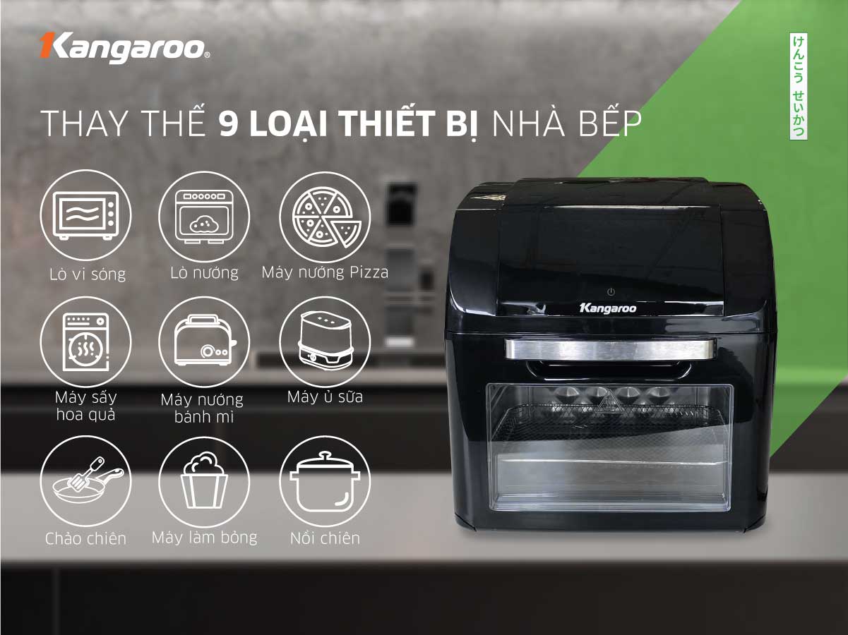 Lò chiên không dầu Kangaroo KG12AF5A với 10 chế độ nấu chuyên sâu, dung tích lớn 12 lít, thay thế 9 loại thiết bị nhà bếp mang đến sự tiện lợi cho khách hàng. Mọi công năng hiện đại nhất được tích hợp trong chiếc Lò chiên không dầu Kangaroo 12L KG12AF5A.